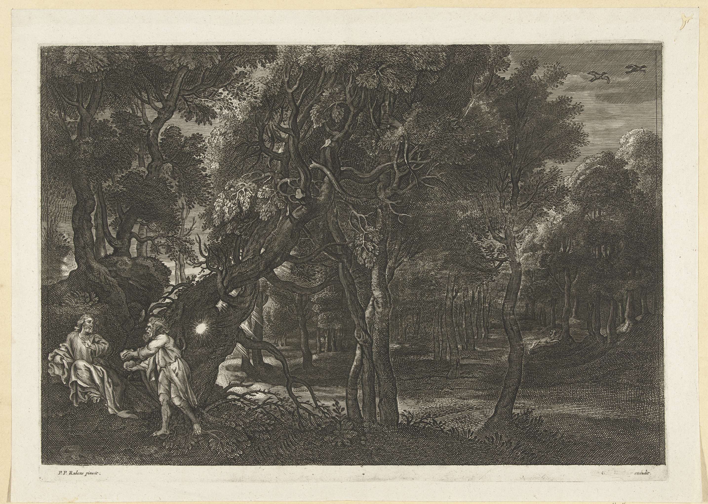 Boslandschap met verzoeking van Christus