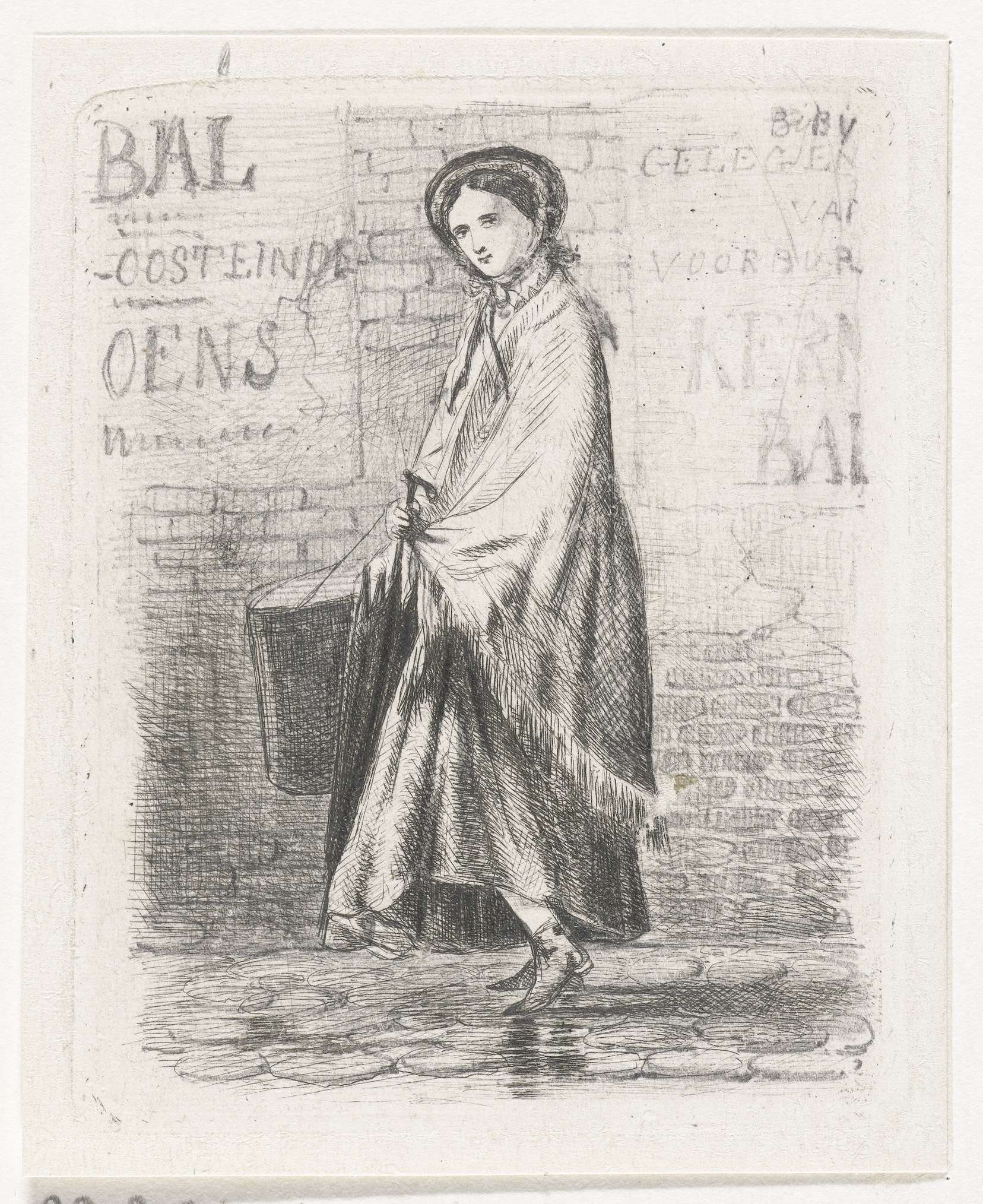 Een jonge vrouw in 19de eeuwse kleding met hoed en mantel wandelt over straat. Ze heeft een hoedendoos en een paraplu bij zich. Achter haar aan de muur hangen Nederlandse reclameposters.