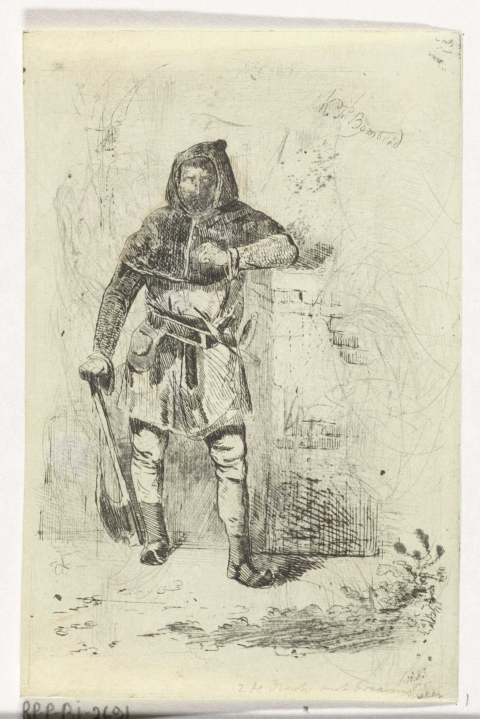 Een bebaarde man met kap staat tegen een muurtje geleund. Hij heeft een bijl in zijn rechterhand en draagt een zwaard aan de gordel.