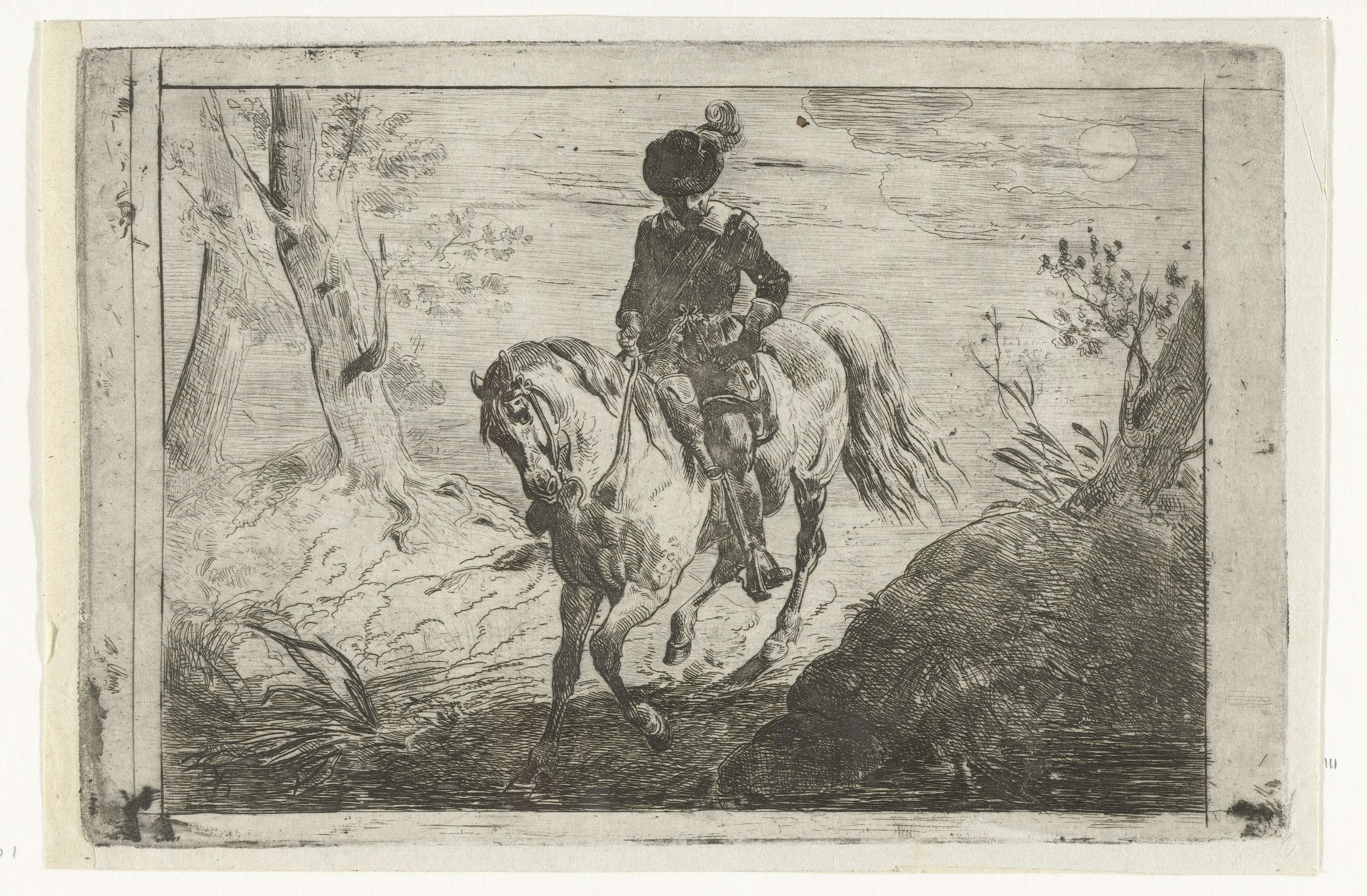 Een man te paard rijdt over een weg in het bos. Het is volle maan.