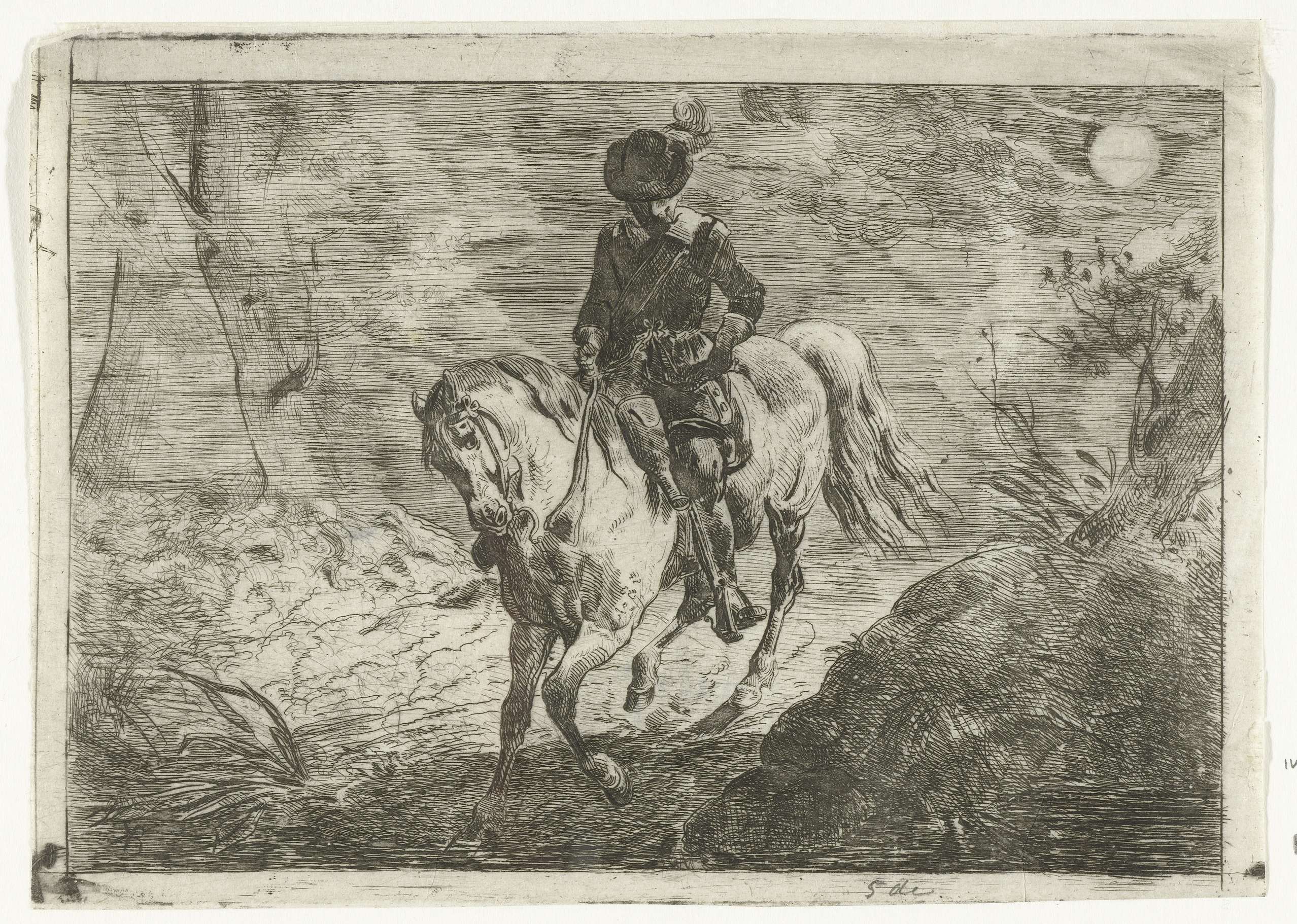 Een man te paard rijdt over een weg in het bos. Het is volle maan.