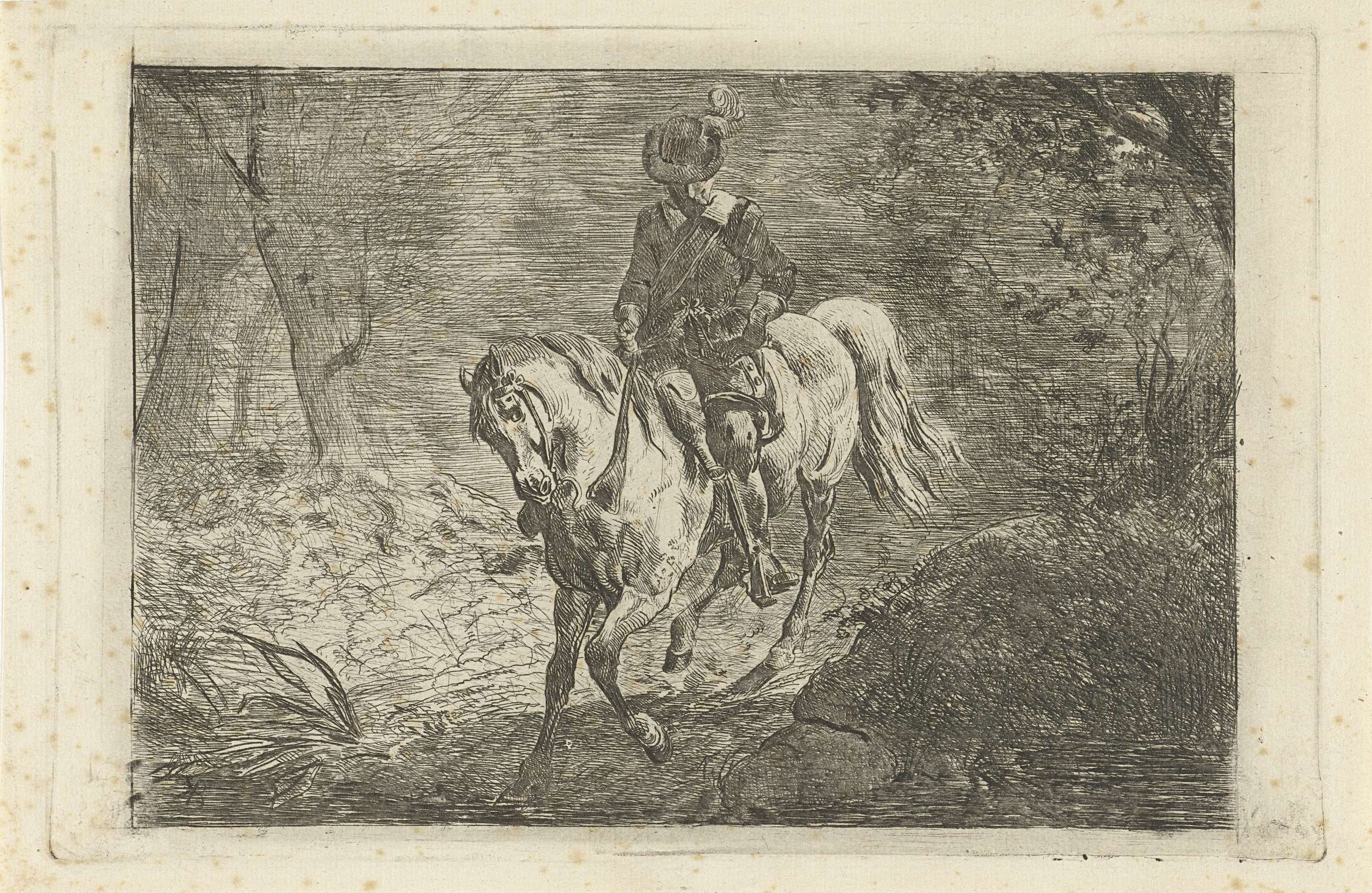 Een man te paard rijdt over een weg in het bos. Het is volle maan.