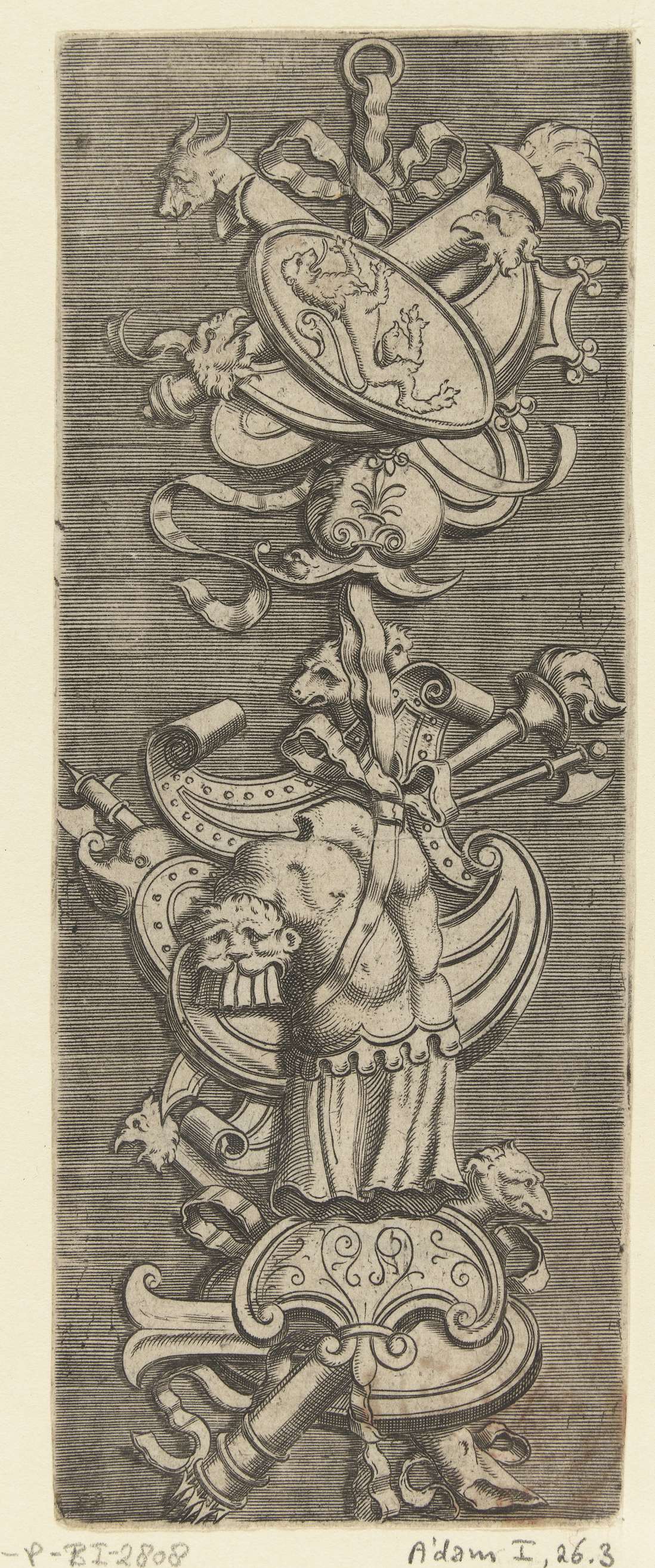 Bovenaan hangen schilden, waarvan één met de voorstelling van een leeuw. Daaronder hangt een wapenrusting. Hoort bij 5 bladen uit een serie van 7.