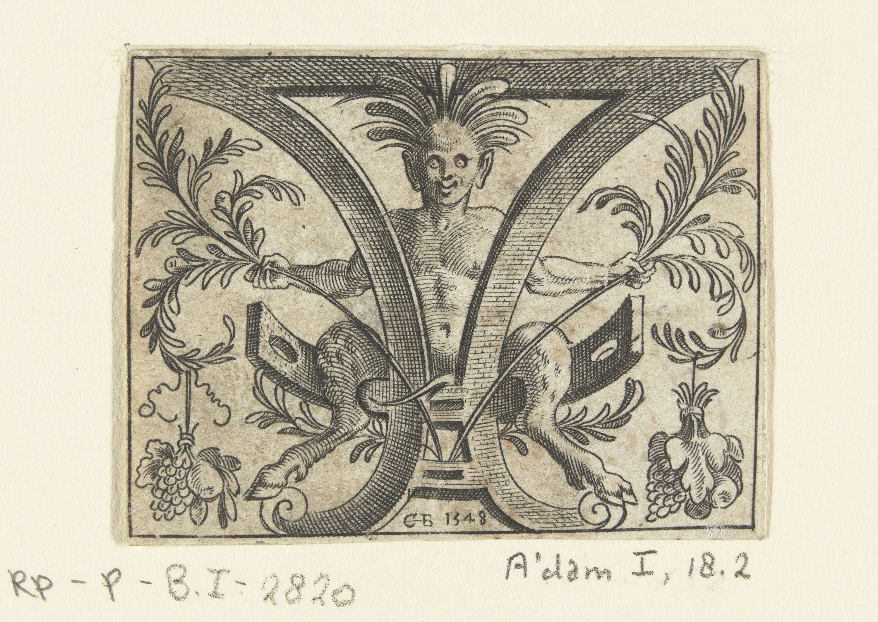 In elke hand houdt de sater een lauriertak waar een trosje fruit aan hangt. Een van 4 bladen uit een serie van 8.