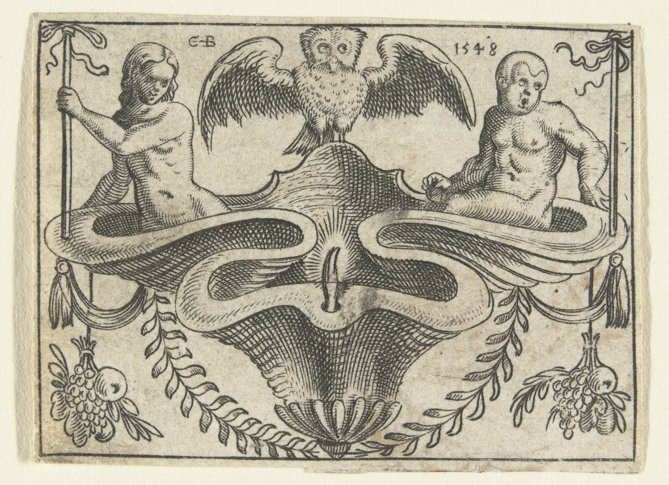 In het bekken zitten een man en een vrouw. Midden achter zit een uil, midden voor brandt een vlammetje. Een van 4 bladen uit een serie van 8.