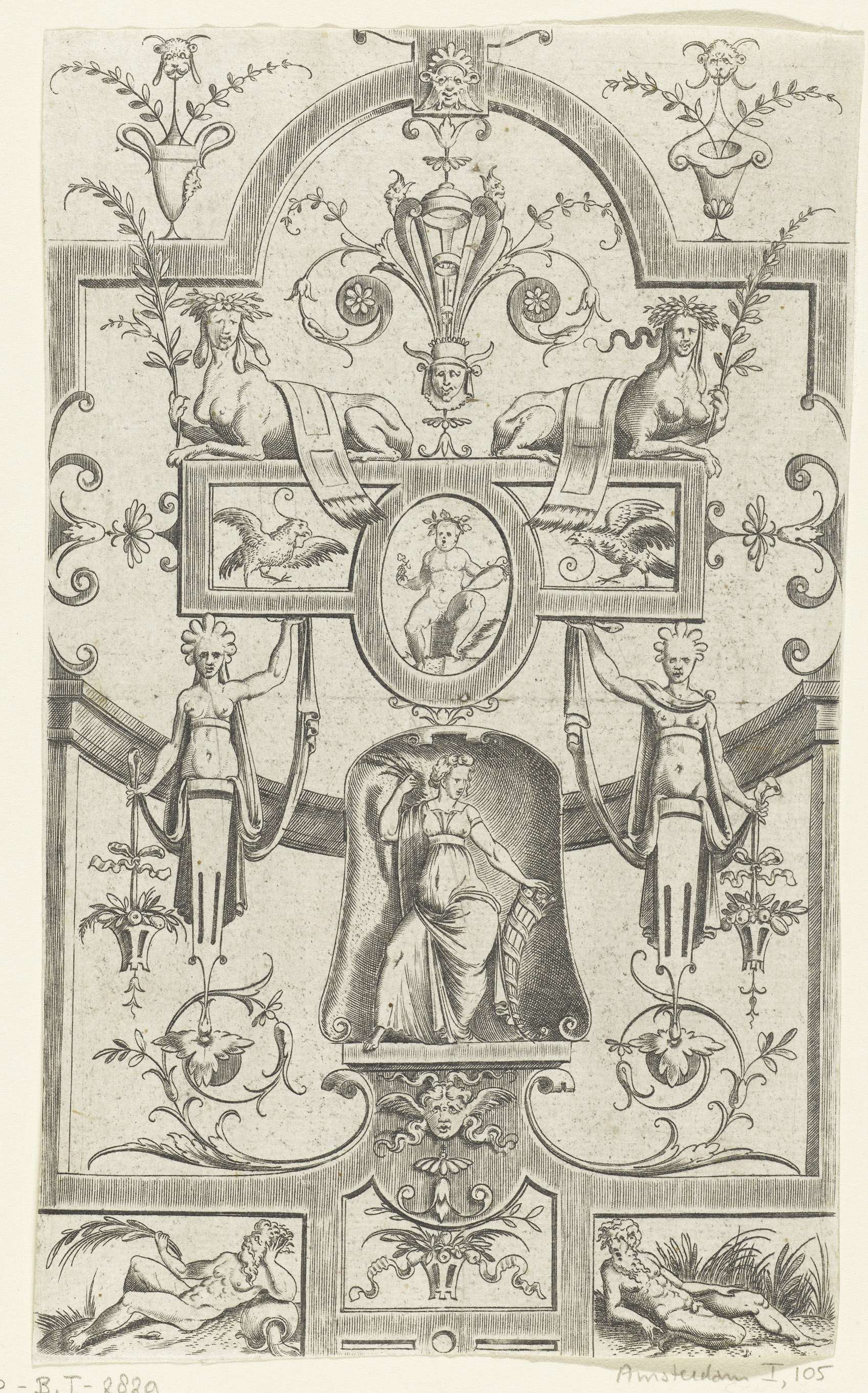 Ceres staat in een nis. Twee vrouwelijke hermen ter weerszijden van de nis houden een cartouche omhoog waarin Bacchus zit, geflankeerd door twee vogels.