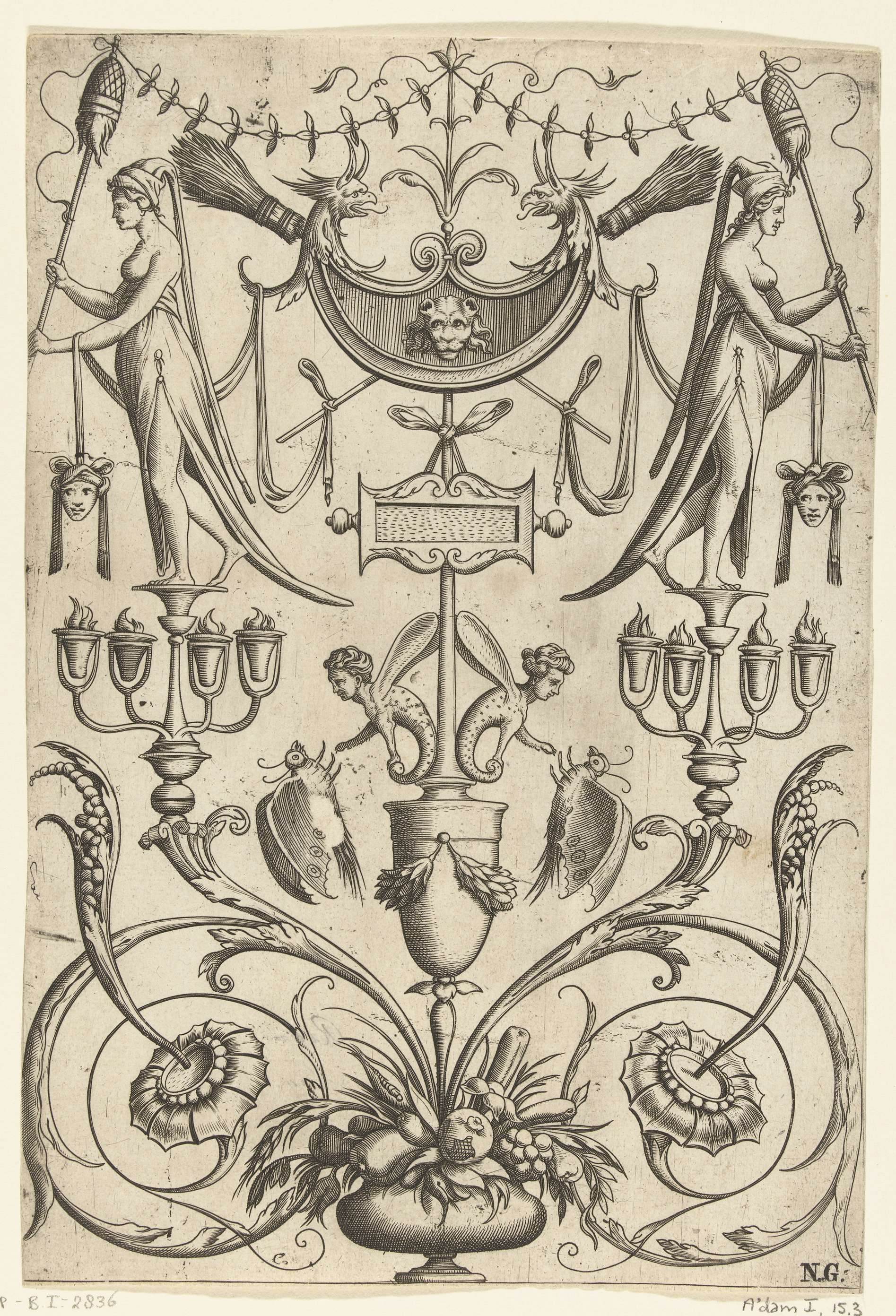 Links en rechts boven staat op een vierarmige kandelaar een vrouw met een spinrokken. Blad uit serie van 9 bladen.