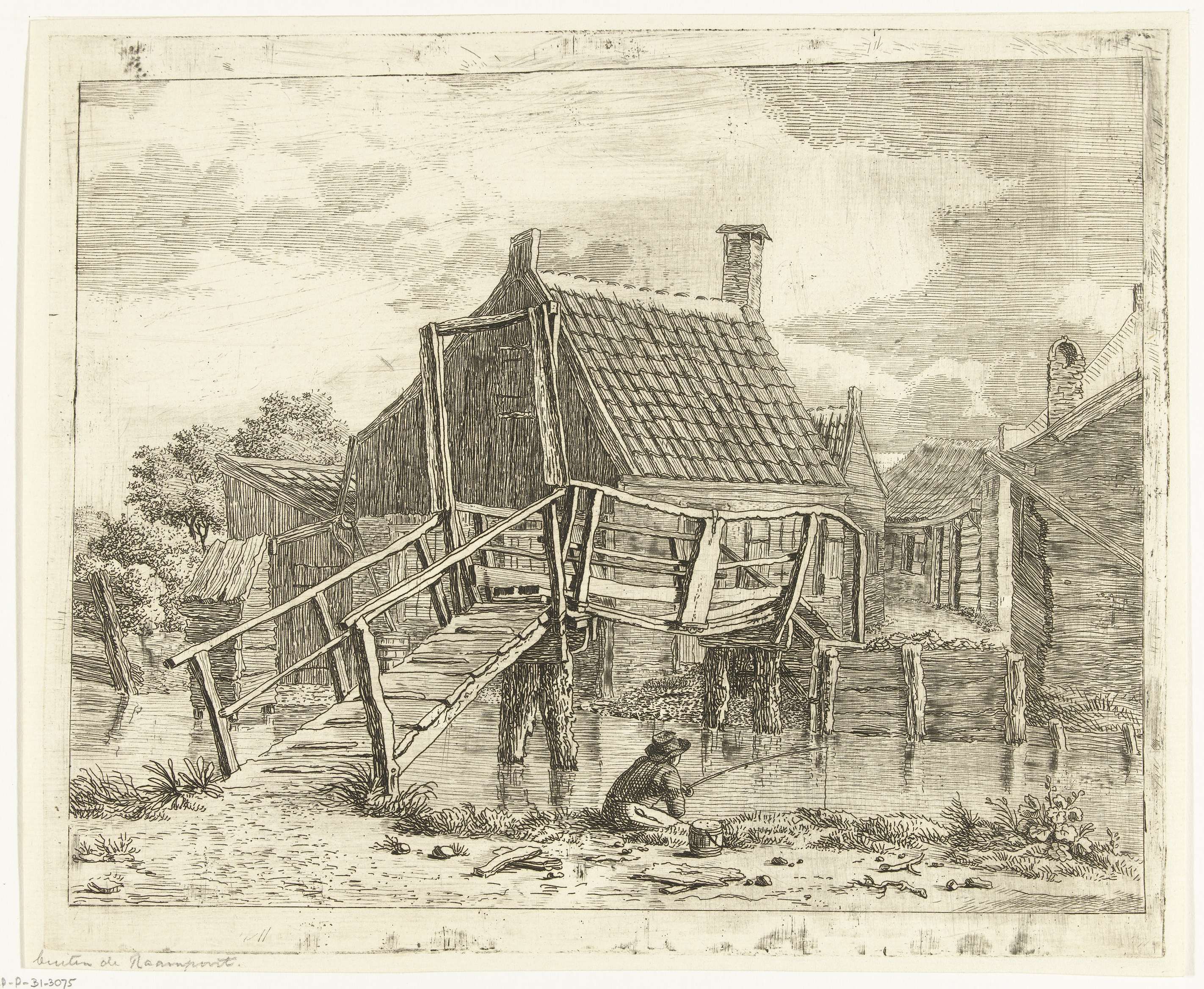 Een man zit aan de oever van een sloot te hengelen vlakbij een houten brug.
