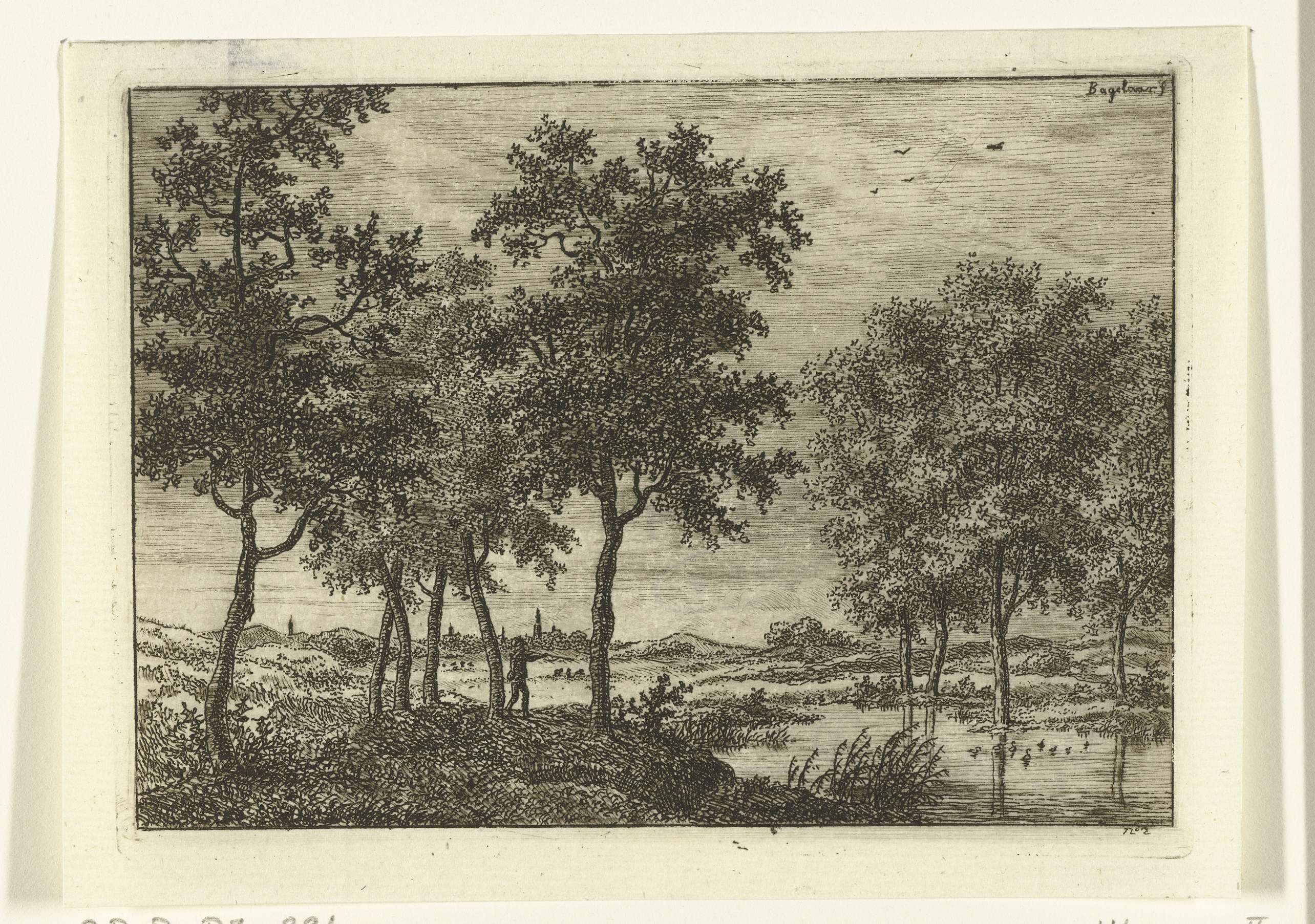 Landschap met jager die op wilde eenden schiet