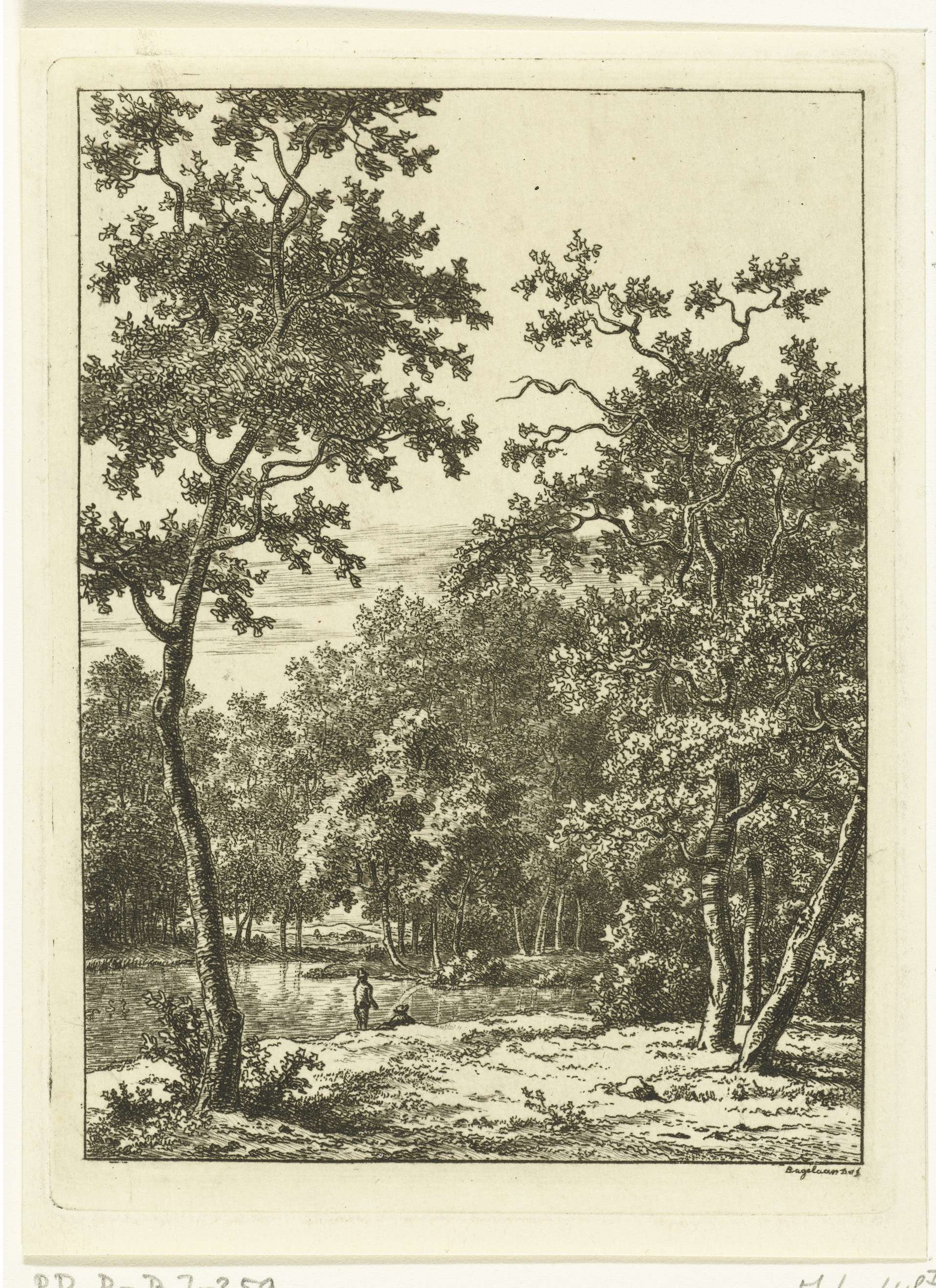 Landschap met twee mannen aan de oever van een rivier