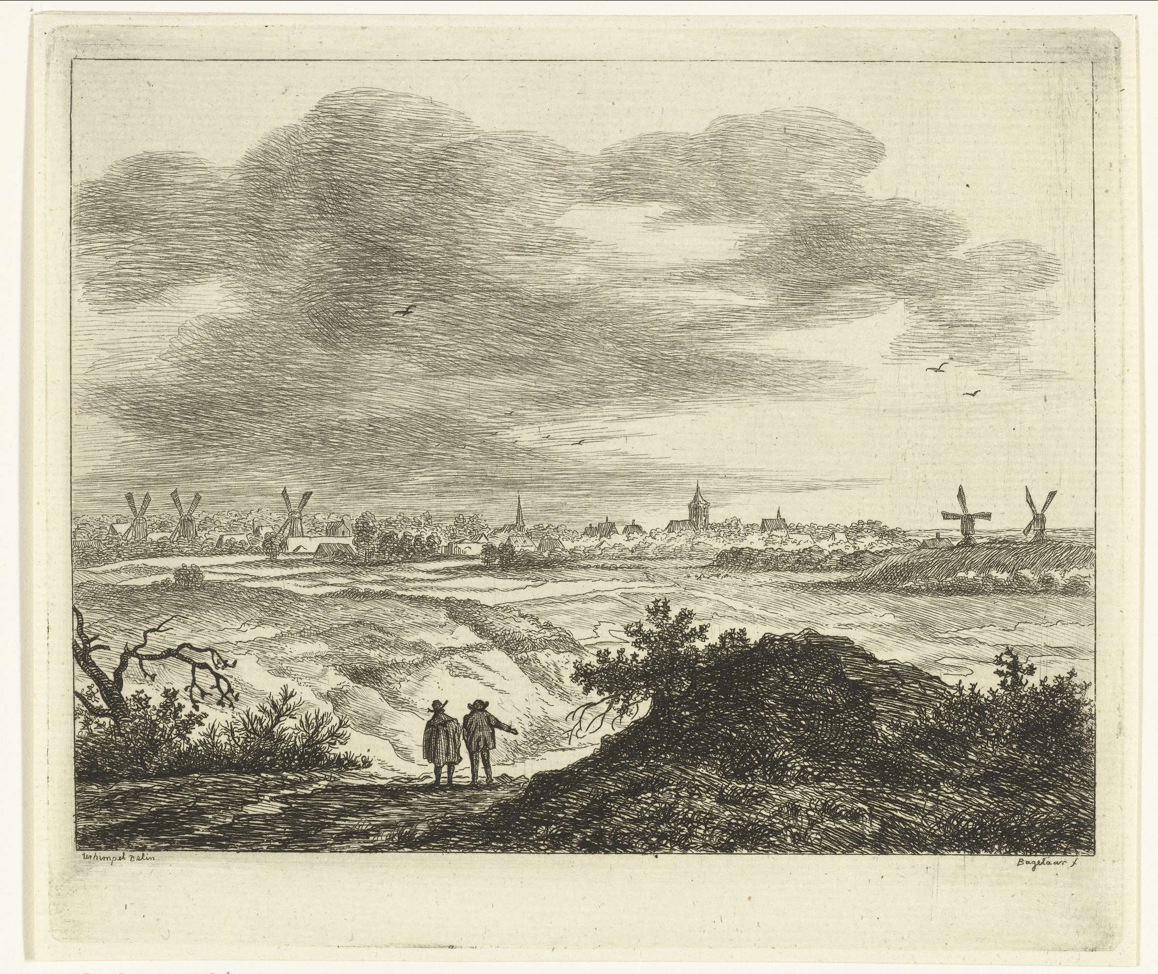 Gezicht op een dorp met molens, op de voorgrond twee wandelaars