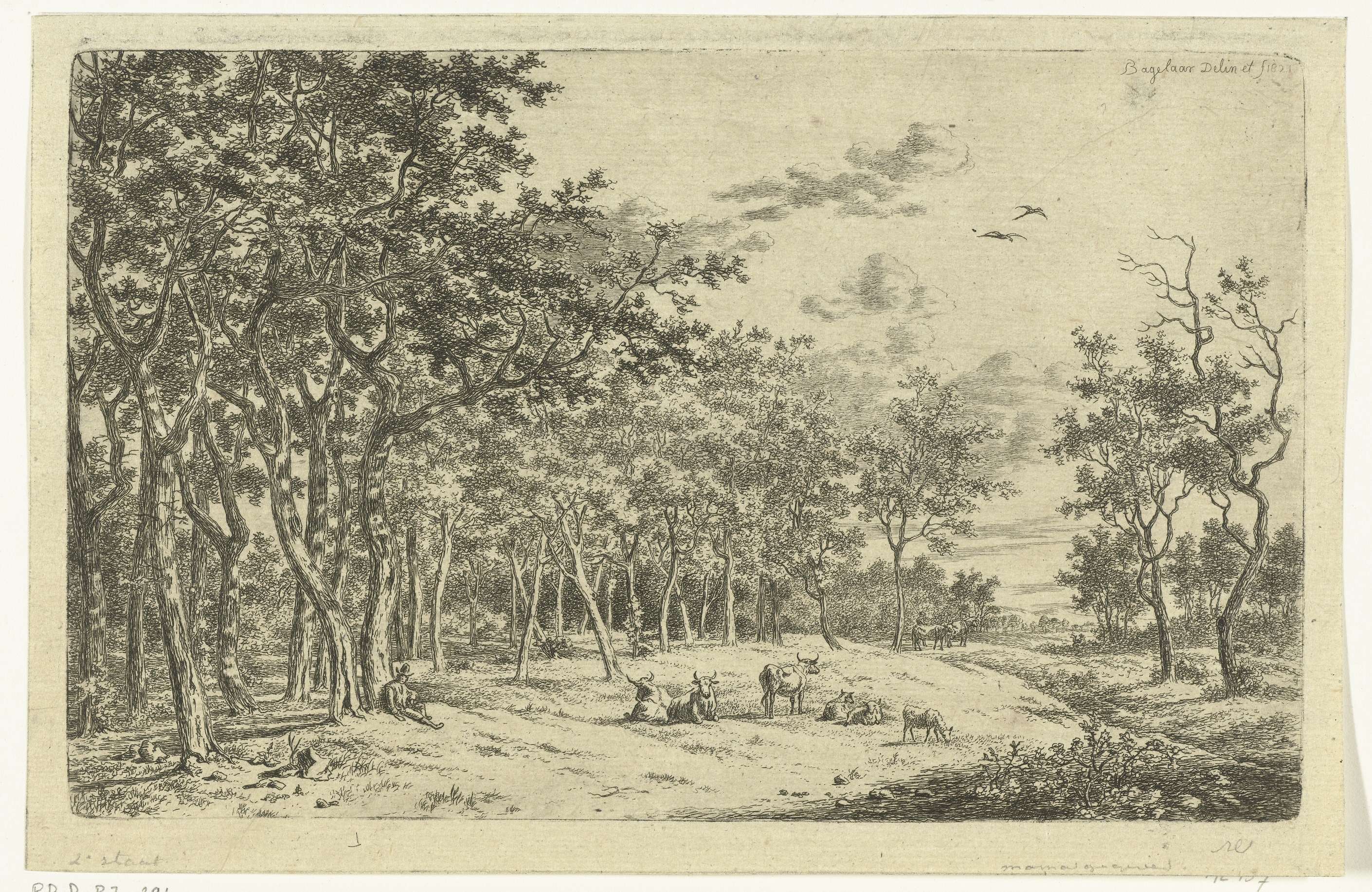 Landschap met een herder en zijn kudde aan de rand van het bos