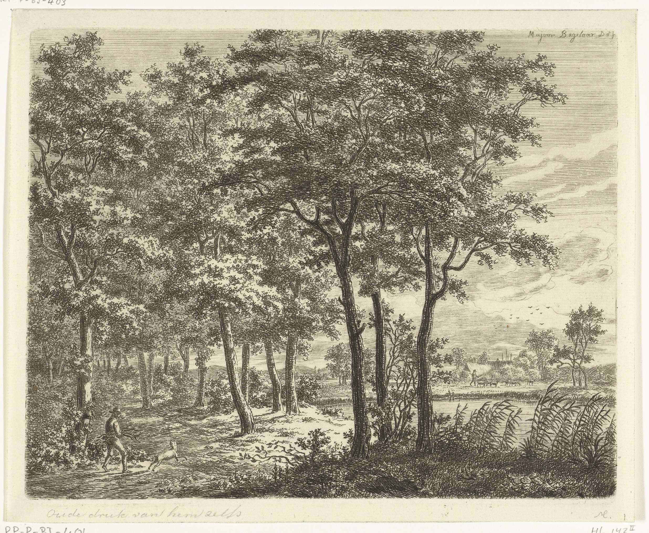 Landschap met hond en man die een takkenbos draagt