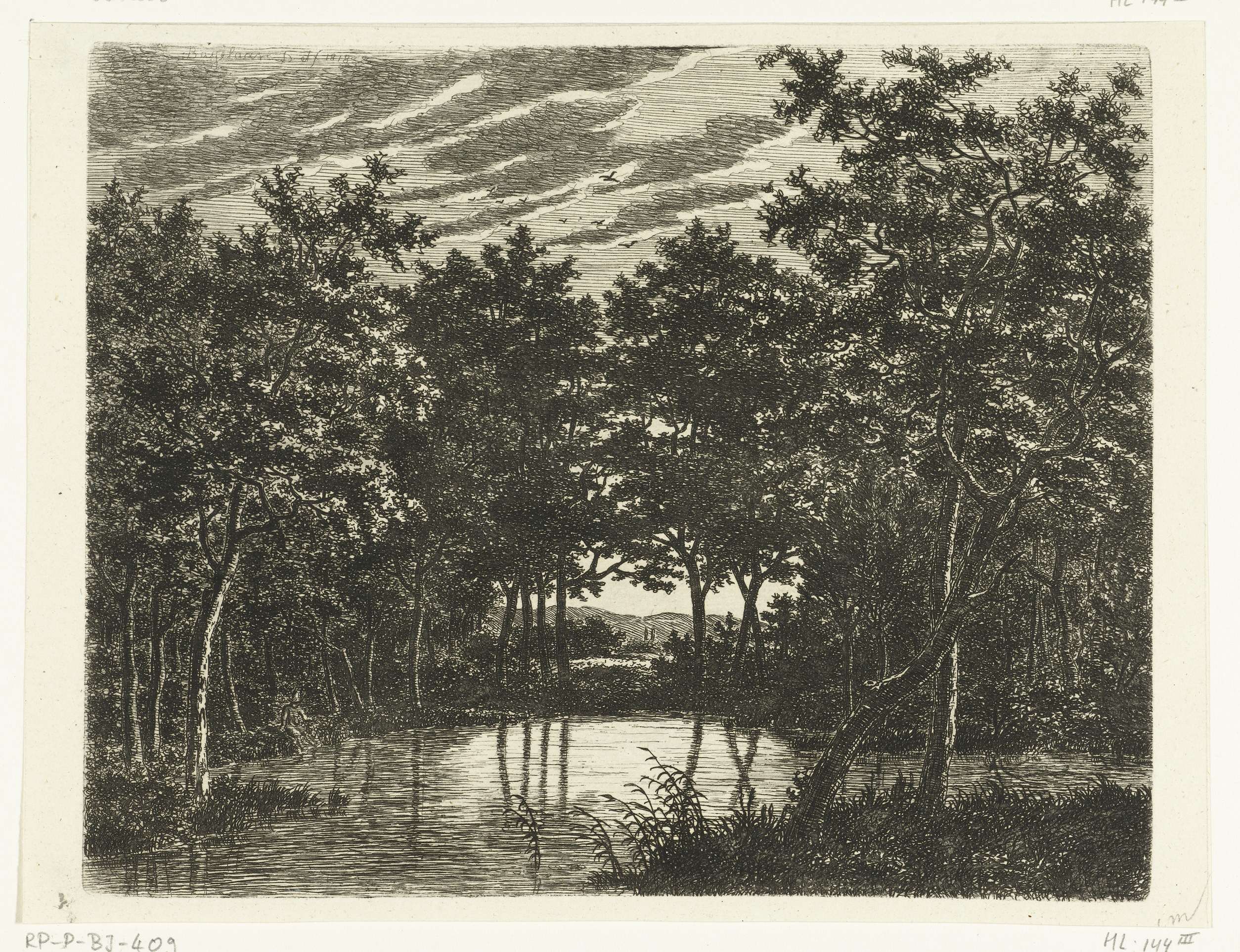 Landschap met vijver, links zit een visser met een puntige hoed