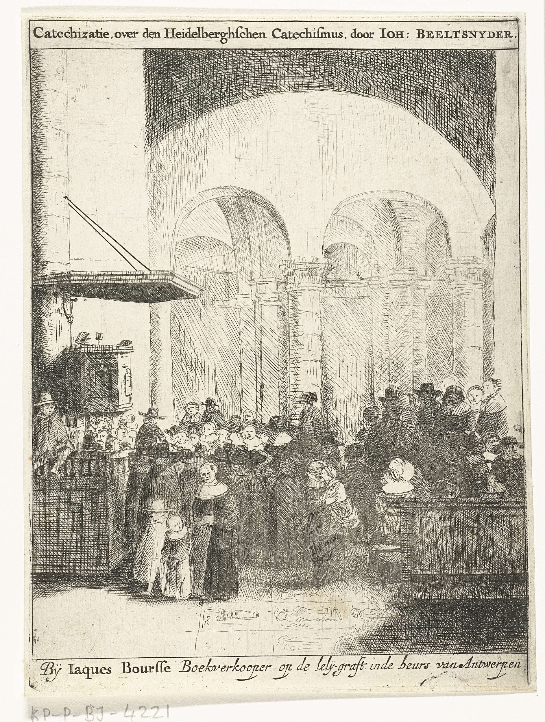 In een kerk vindt een catechisatie plaats. De kerkgangers luisteren aandachtig naar de prediker Johannes Beeltsnyder. Twee vrouwen met kleine kinderen verlaten de kerk om de les niet te verstoren. Links zit een jongetje op een hoge houten afsluiting van de preekstoel.