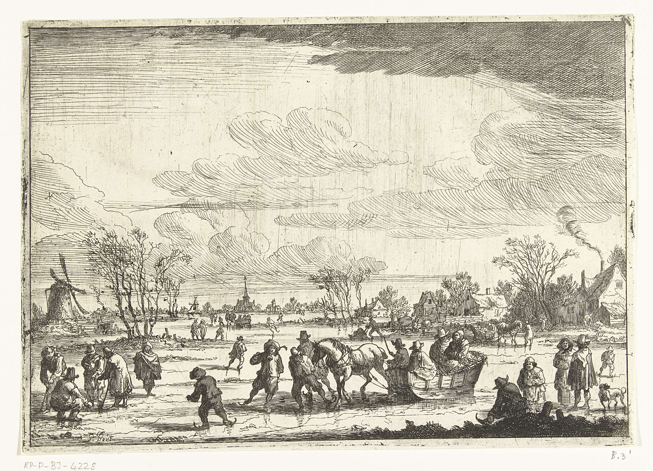 Schaatsers op het ijs. In het midden een arrenslee met vier personen die getrokken wordt door een paard. Aan de oever bind een man zijn schaatsen onder en staan wat mensen te kletsen. In de verte een molen en een kerktoren.