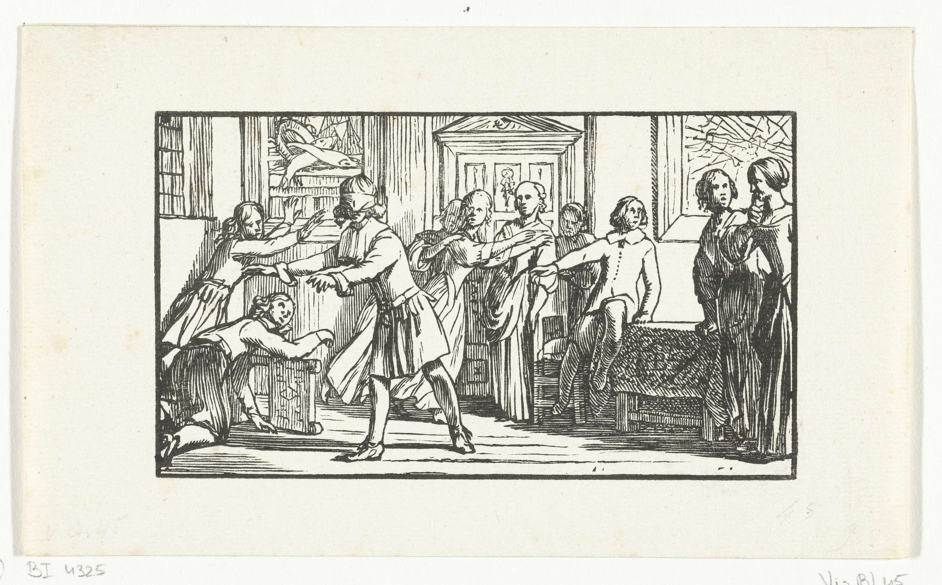 Een groep kinderen speelt blindemannetje in een kamer. Op de achtergrond liggen twee vissen in een kast.