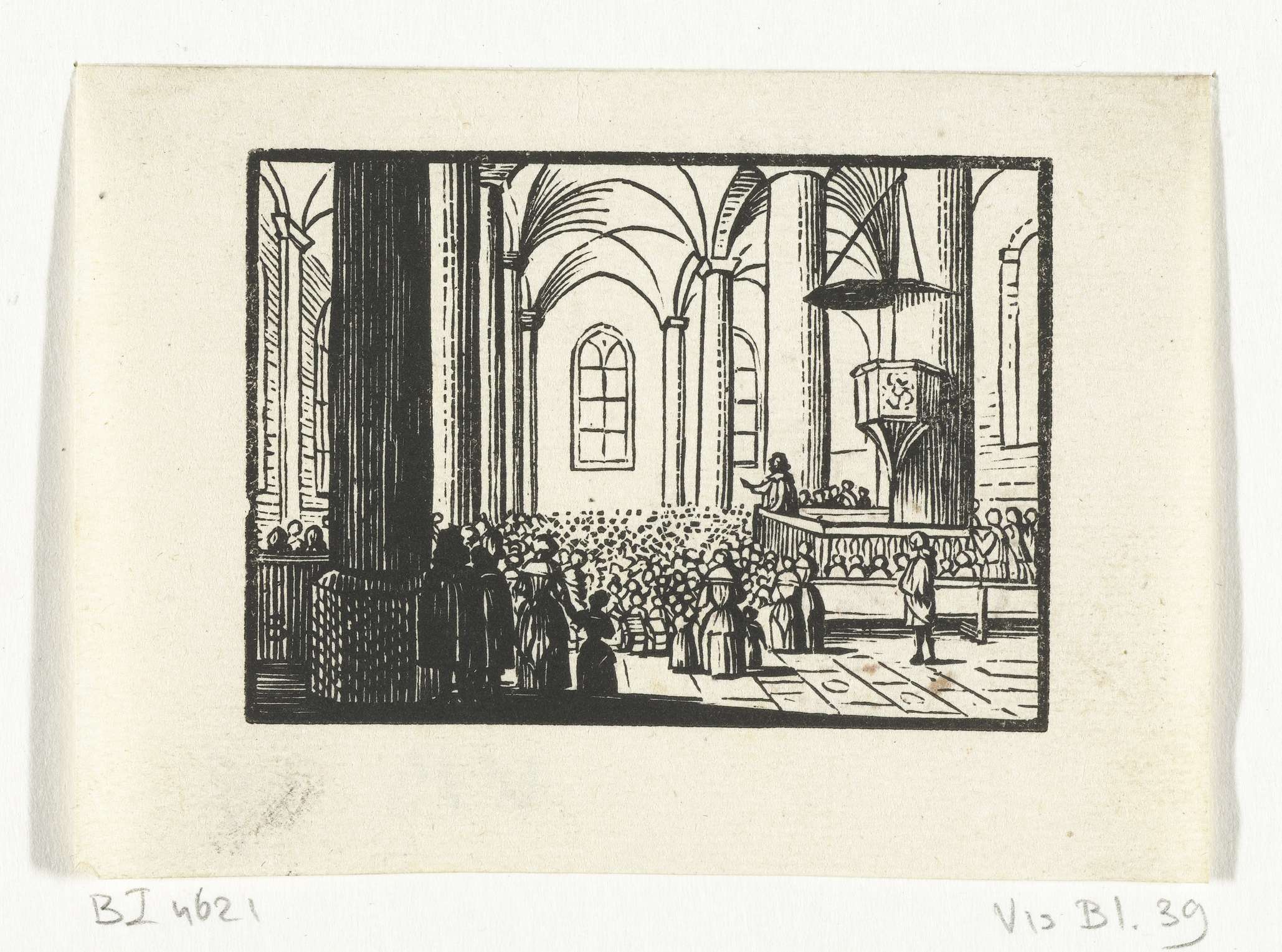 De preekstoel is leeg. Daaronder, vanachter een balustrade, spreekt een predikant de gemeente toe. Op de voorgrond staan twee mannen en een vrouw met een kind naast een grote zuil.