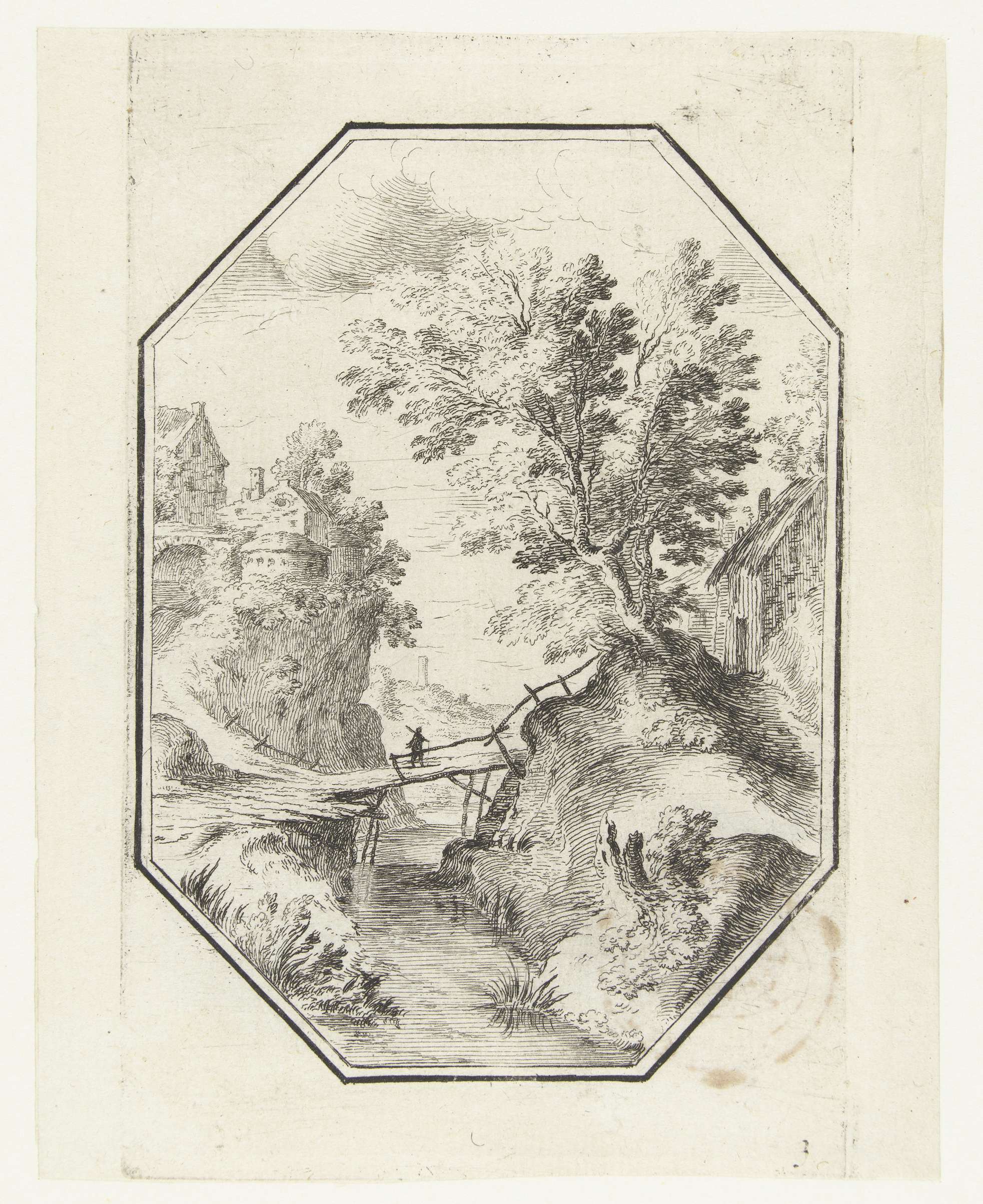 Landschap met houten brug in octagonaal kader