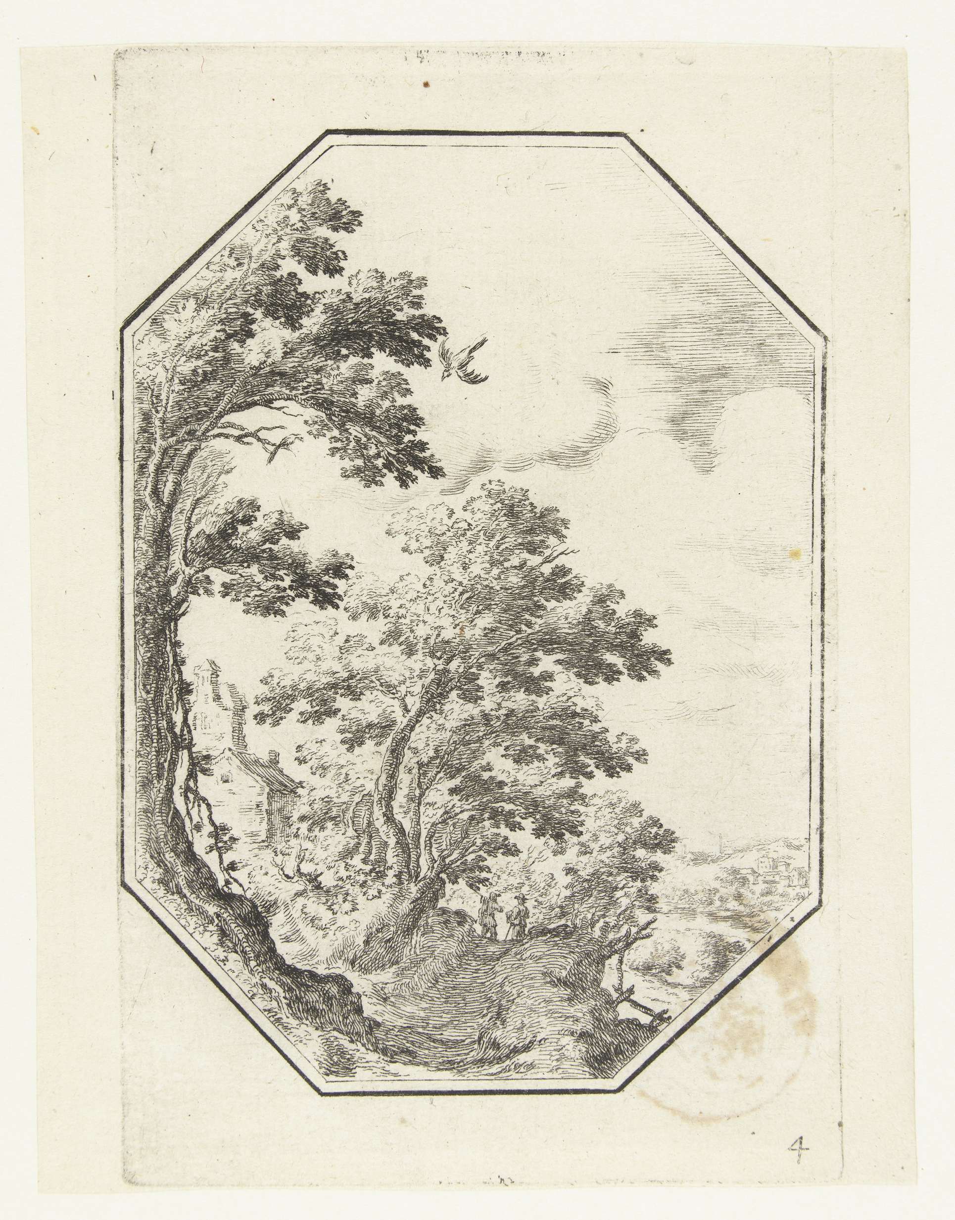 Landschap met pad tussen bomen in octagonaal kader, kopie naar prent van Paul Bril met landschap spiegelverkeerd weergegeven