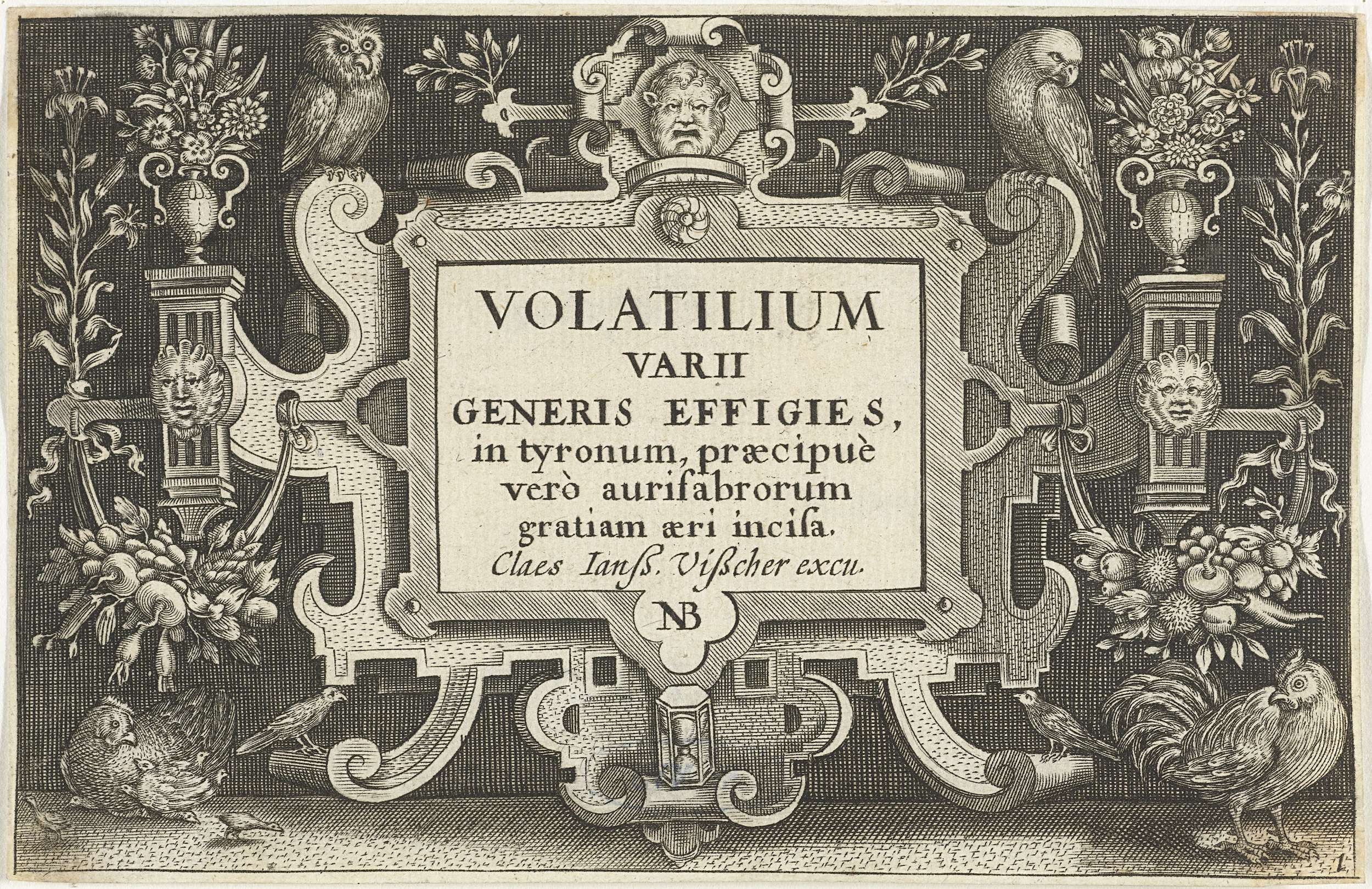 Titelprent met titel in cartouche met ornamenten zoals guirlandes en bloemvazen. Vogels waaronder papegaai en uil zitten op het rolwerk. Onder een haan en hen met kuikens.