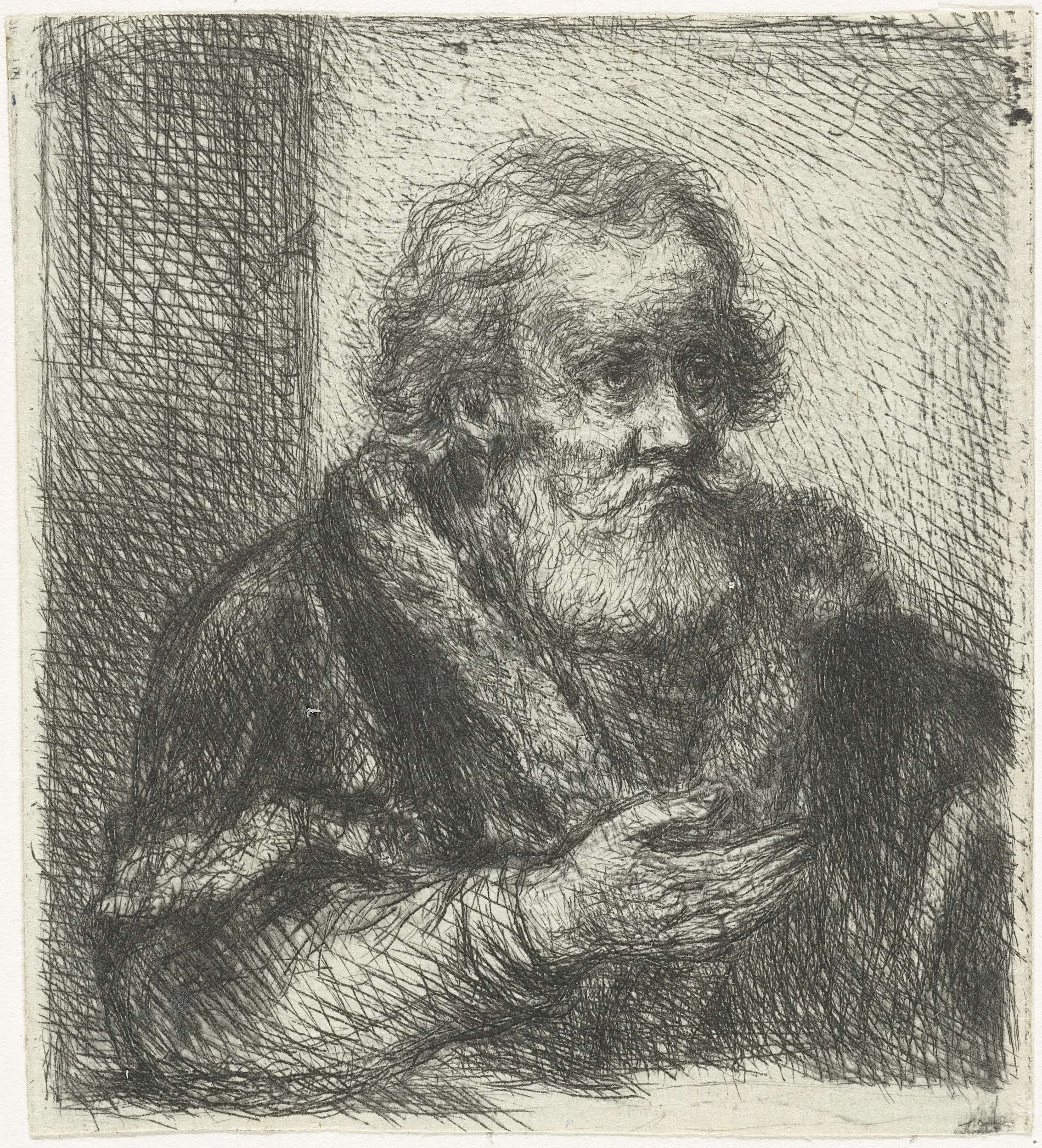Een oude man met baard en bontkraag. Buste naar rechts.