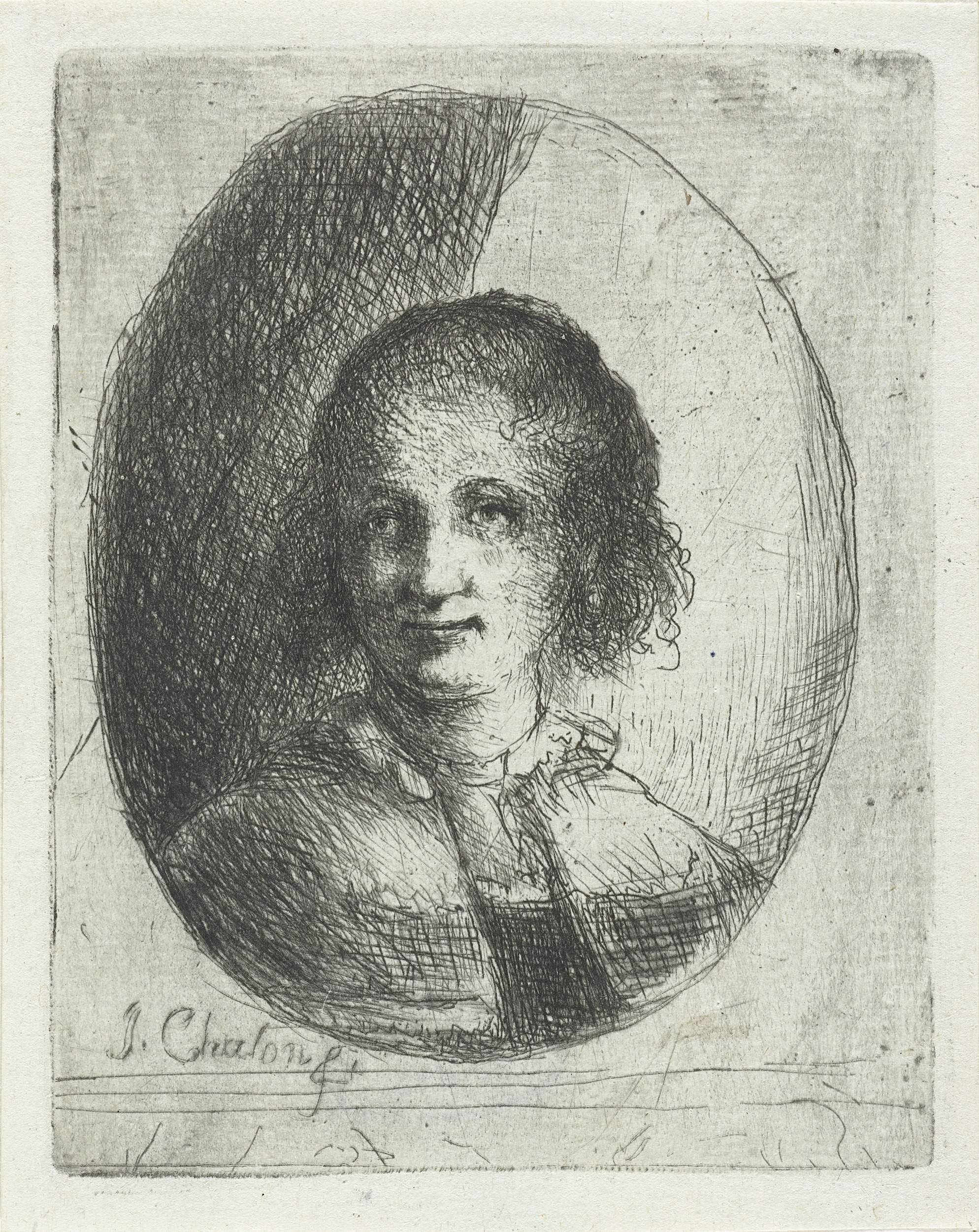 Portret in ovale lijst van Christina Chalon, prentmaakster en zus van Jan Chalon. Buste en face, iets naar links.