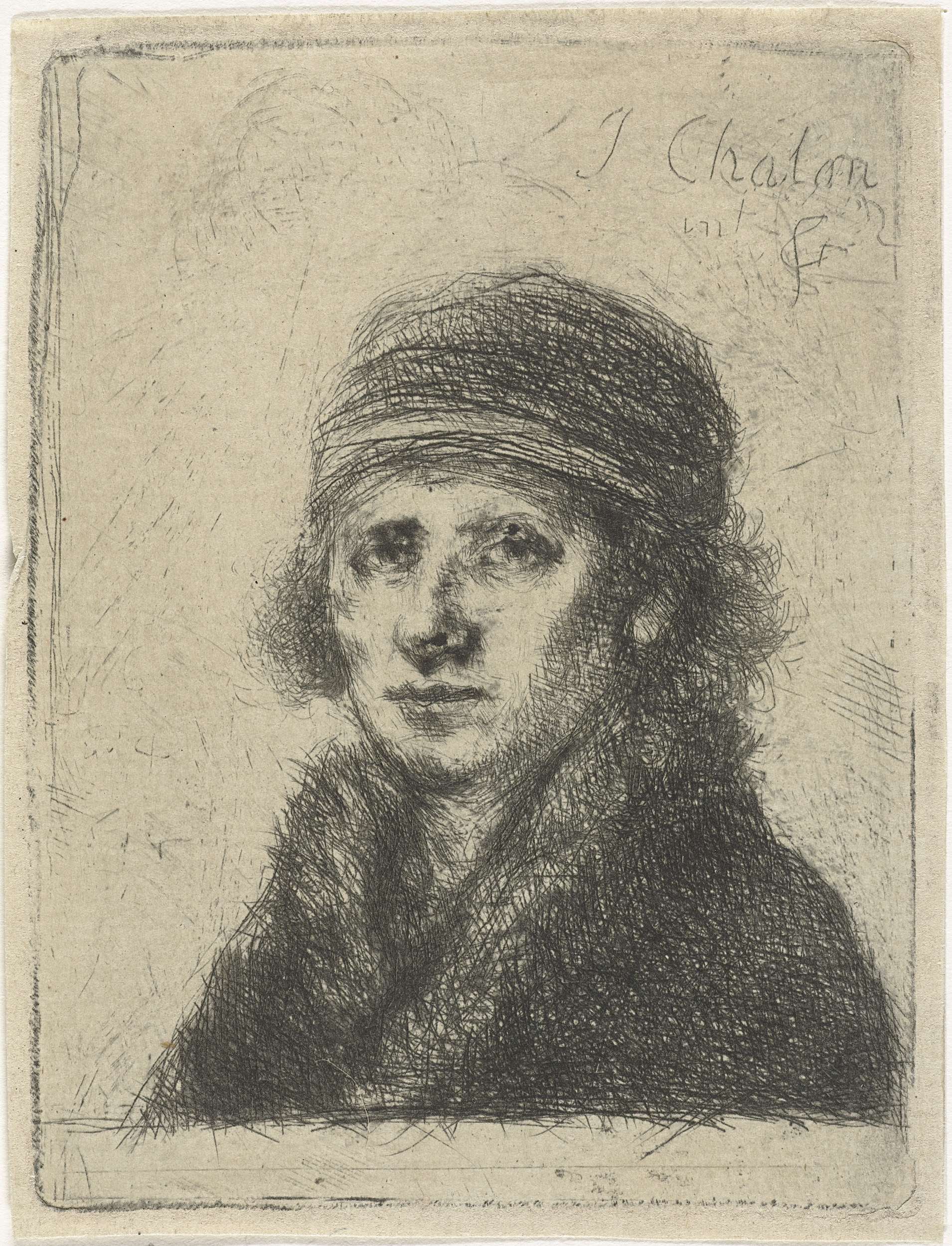 Een jongeman met een bontkraag en een muts. Buste naar links.