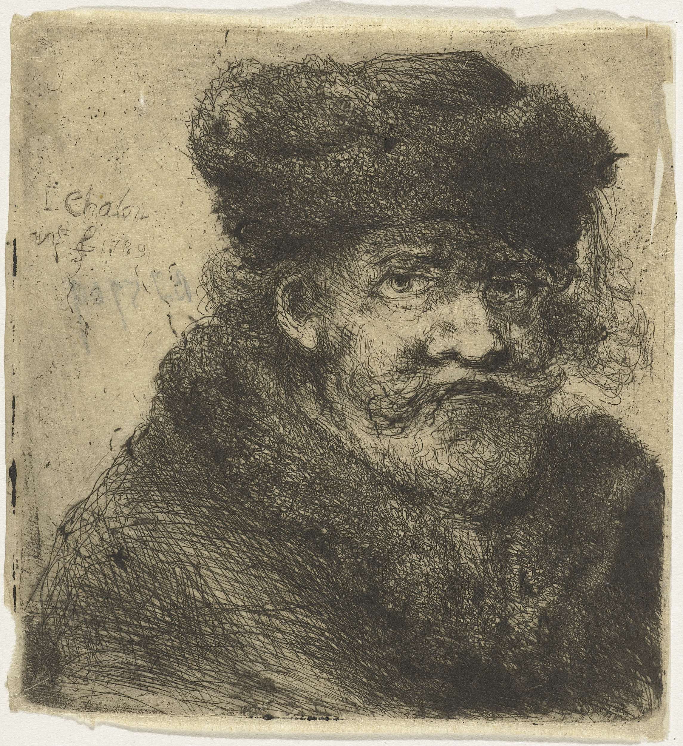 Een oude man met muts en baard. Buste naar rechts.