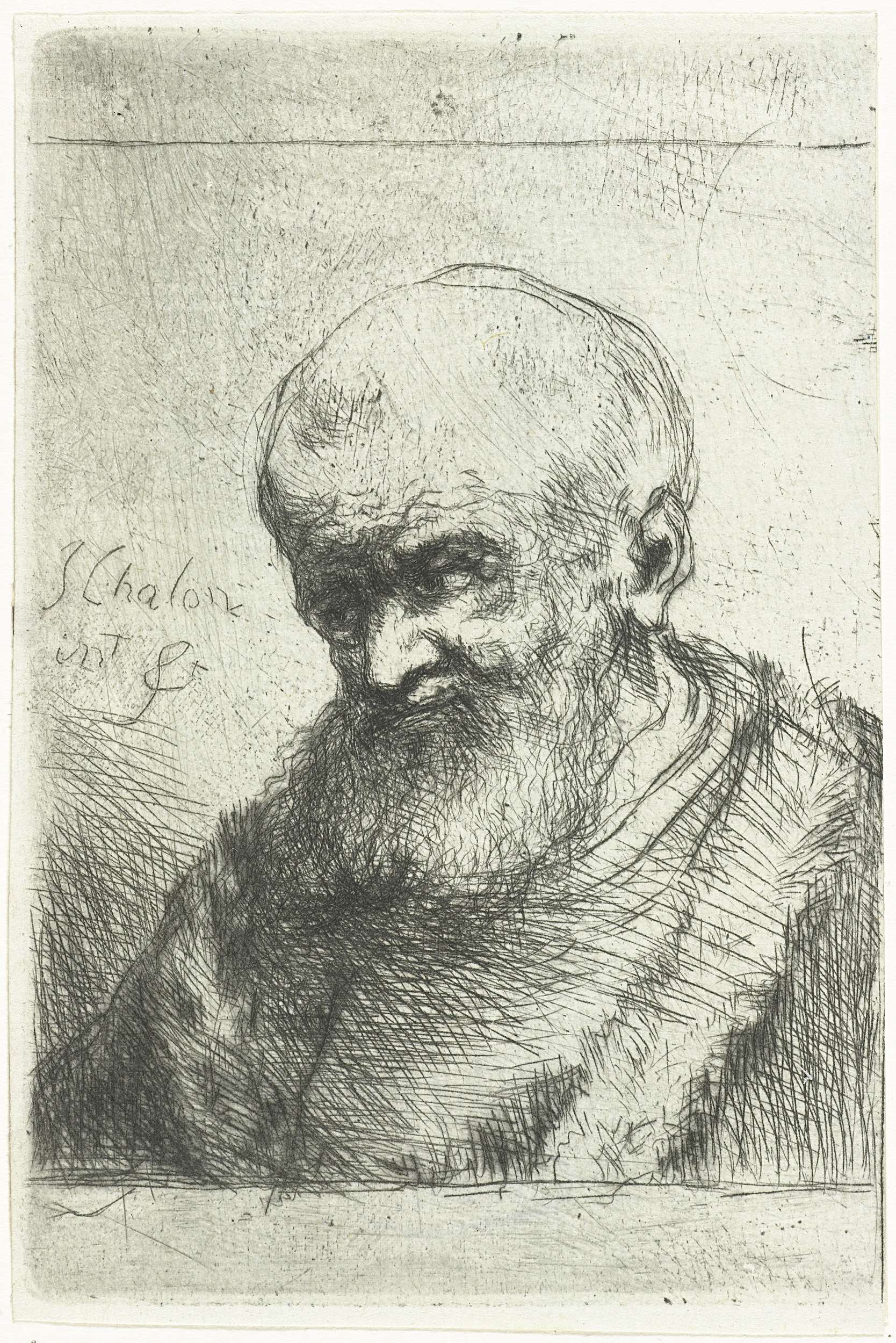 Het portret is van een oude man met een baard en een pelsmantel. Buste naar links.