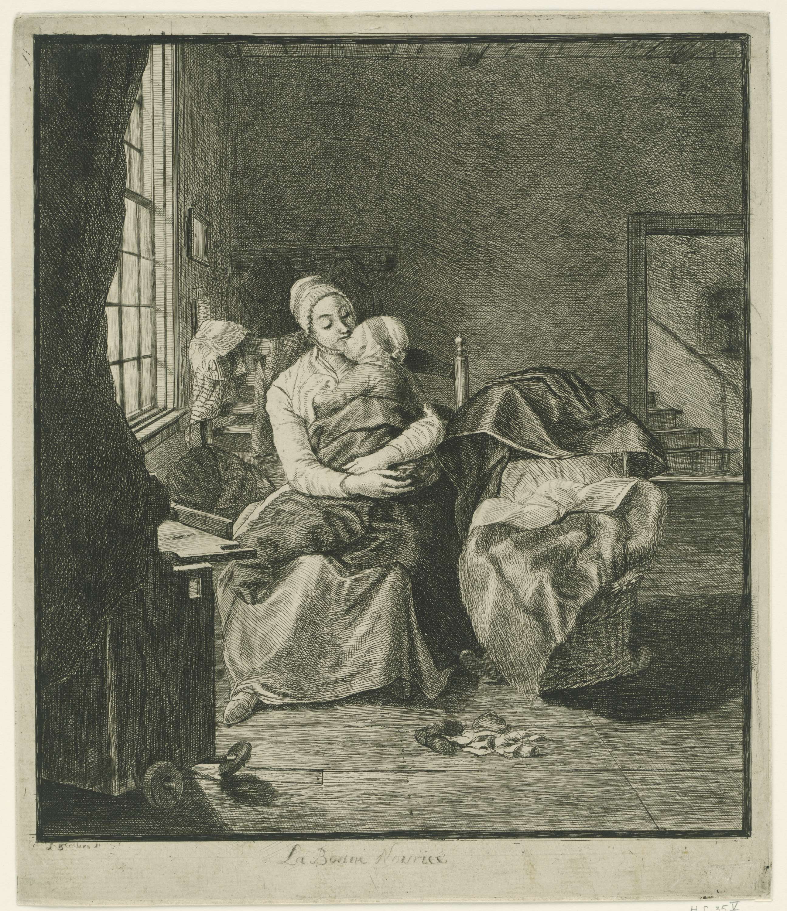Een jonge moeder zit met haar slapende kind op schoot voor het raam. Naast haar staat de wieg. Links bij het raam een kinderstoeltje op wielen.