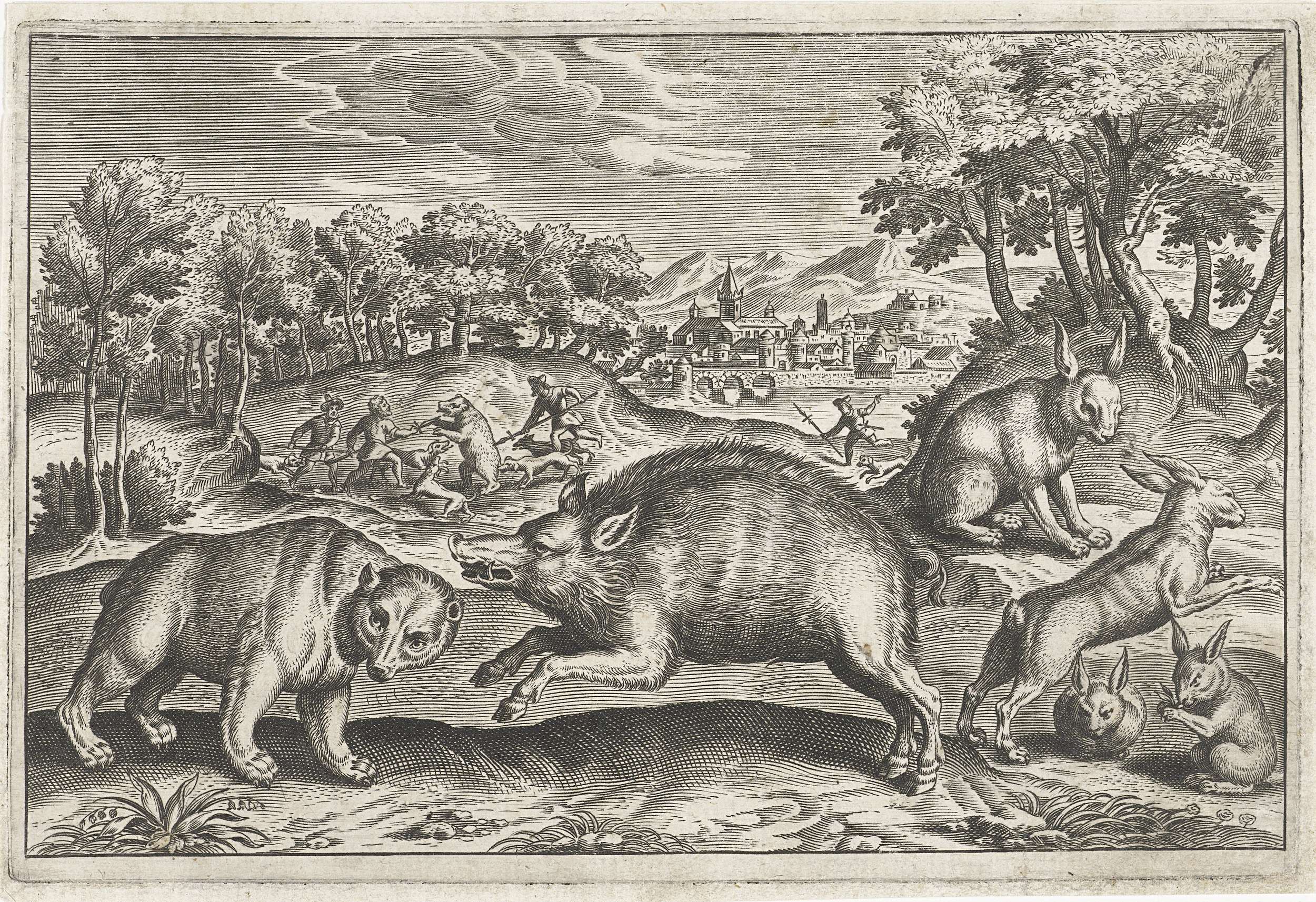 Een beer, een everzwijn en enkele konijnen op de voorgrond. Op de achtergrond een landschap met een berenjacht. De prent maakt deel uit van een serie met dieren als onderwerp.