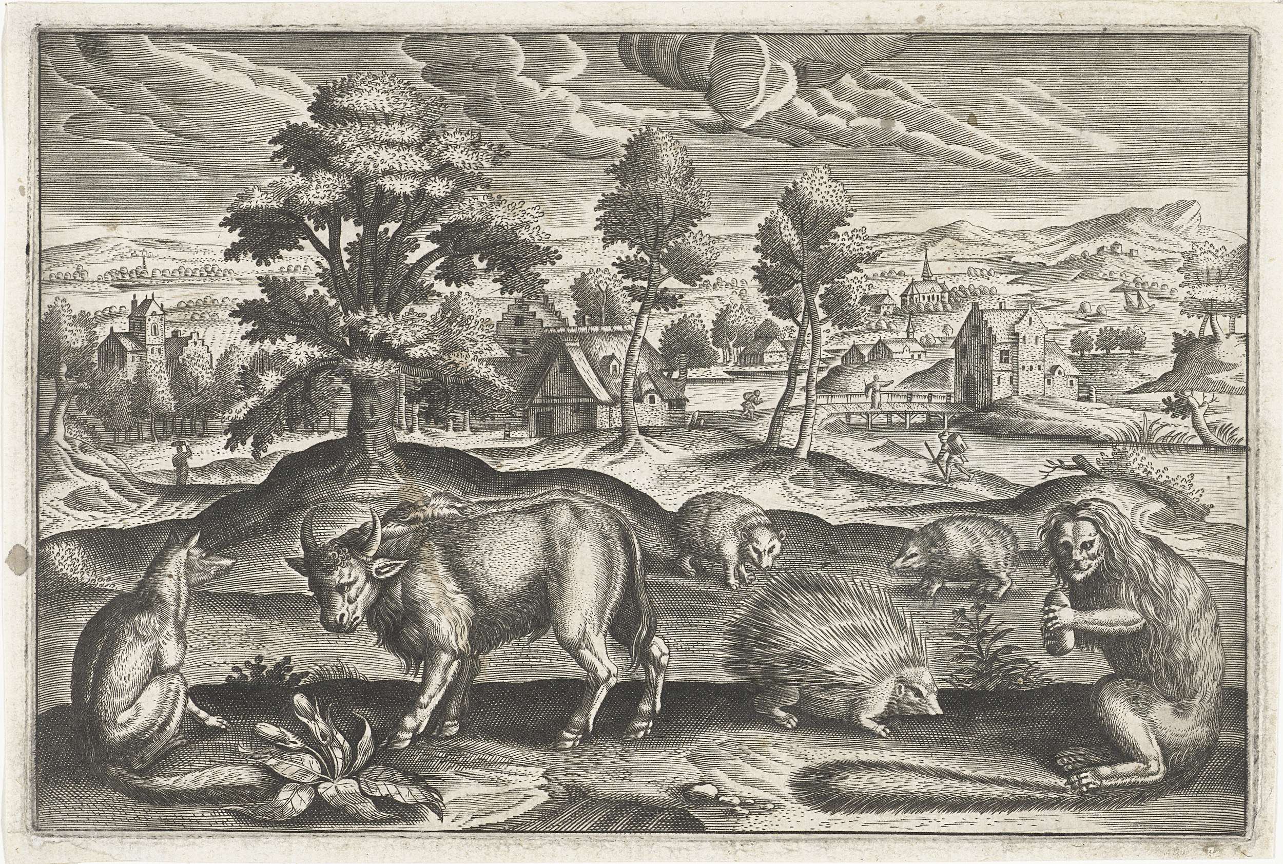 Op de voorgrond een vos, een aap, een stekelvarken, twee egels en een bizon. Op de achtergrond een landschap met een dorp. De prent maakt deel uit van een serie met als onderwerp dieren.