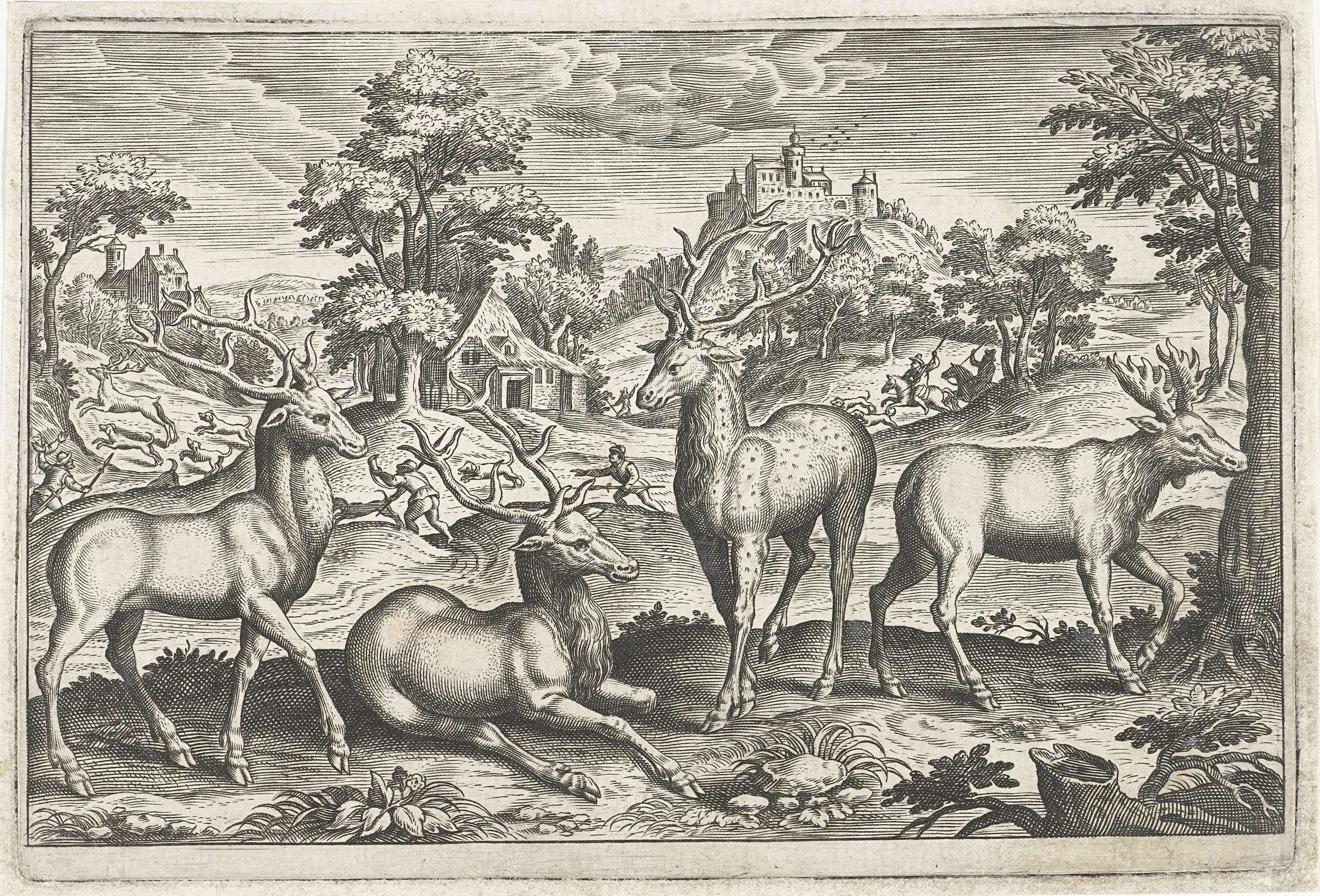 Twee herten, een damhert en een eland op de voorgrond. Op de achtergrond een hertenjacht. De prent maakt deel uit van een serie met dieren als onderwerp.