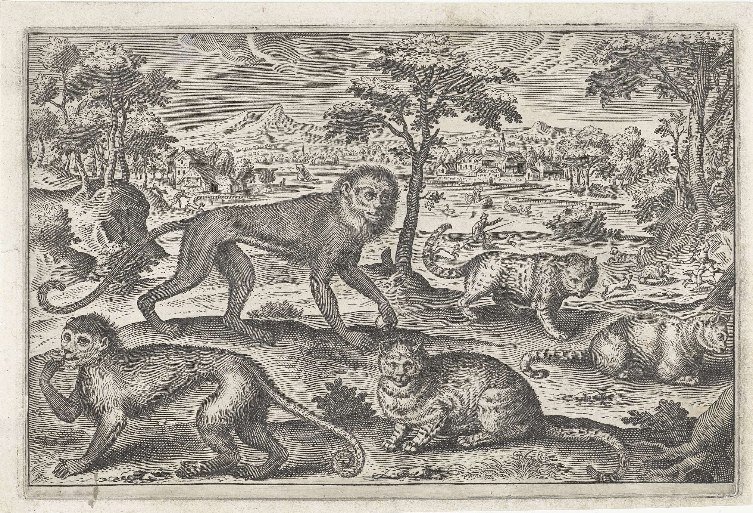 Twee apen en drie katten op de voorgrond. Op de achtergrond een landschap met enkele mannen die jacht maken op apen. De prent maakt deel uit van een serie met als onderwerp dieren.