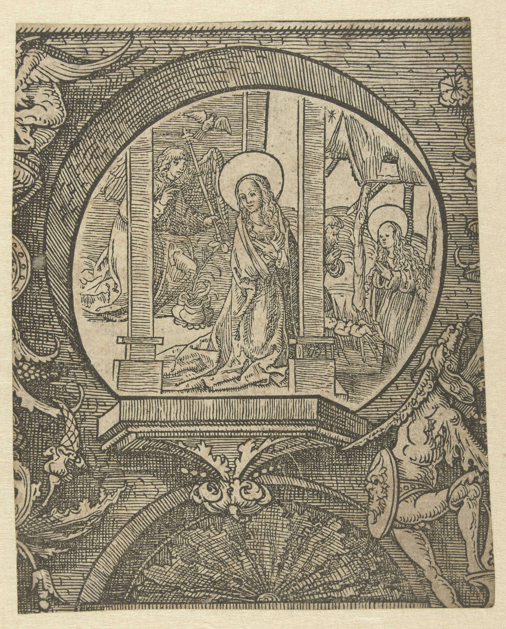 Gedrukt van twee blokken. Ornamentele omlijsting rond voorstelling met links Aartsengel Gabriël, de Heilige Geest en geknielde Maria, rechts Maria en Jozef en het pasgeboren Christuskind.