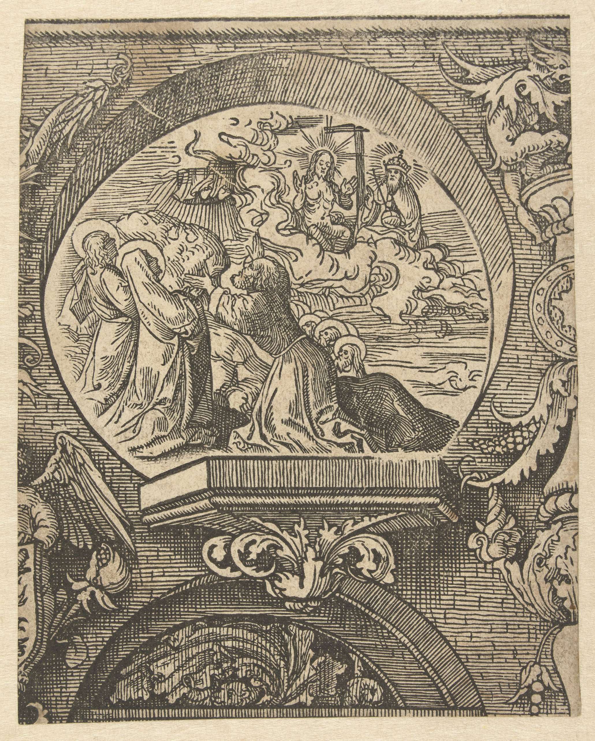 Gedrukt van twee blokken. Ornamentele omlijsting rond voorstelling met Maria, Johannes en apostelen omhoog kijkend naar Christus waarvan alleen voeten en mantel zichtbaar. Op een wolk Christus met gespreide handen voor God de Vader, kruis tussen hen.