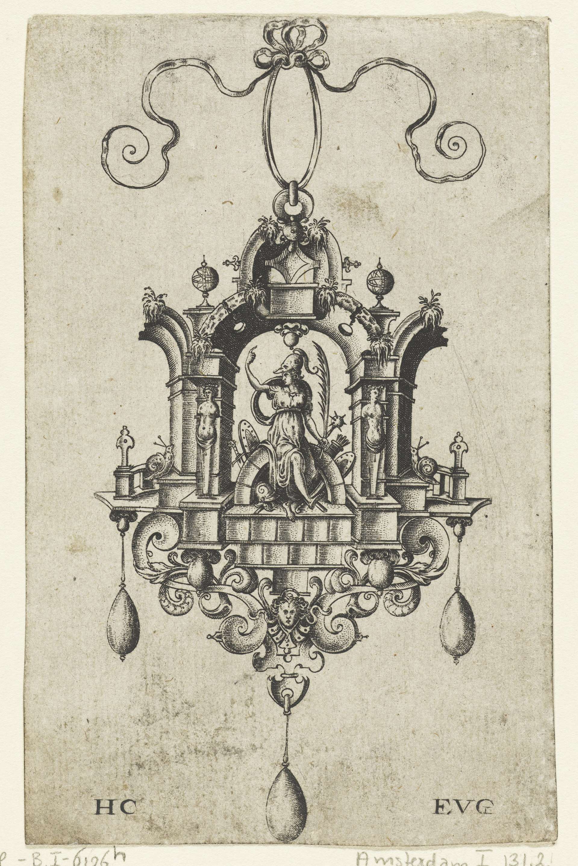 Eén van 9 bladen, uit een serie van 12. Op zes bladen zit in de nis een figuur. Aan elke hanger hangen drie parels.