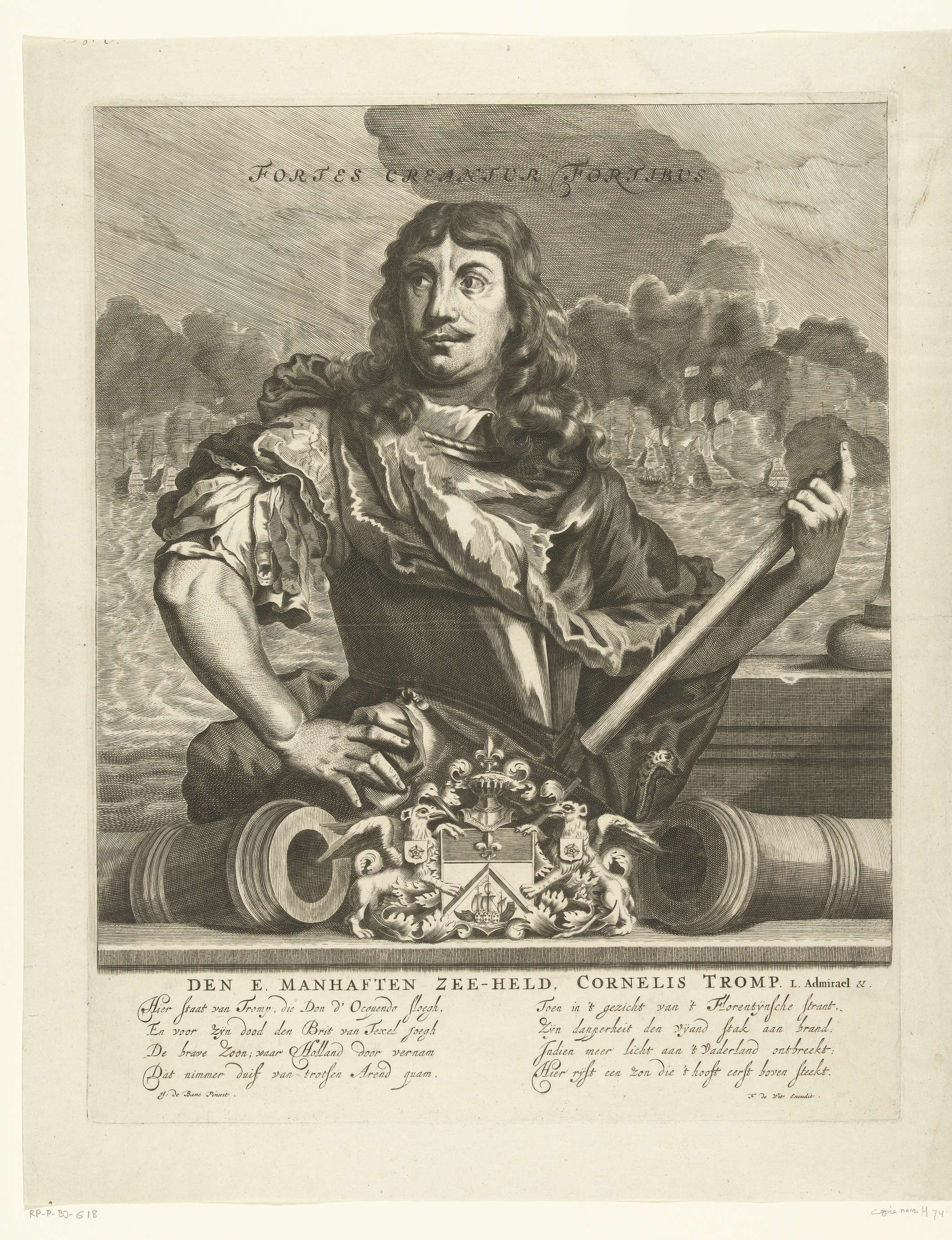 Portret van admiraal Cornelis Tromp met commandostaf in zijn zij. Op de achtergrond is een zeeslag te zien. Onder het portret zijn wapen, naam en titels en een vers van twee kolommen met elk vier regels in het Nederlands.