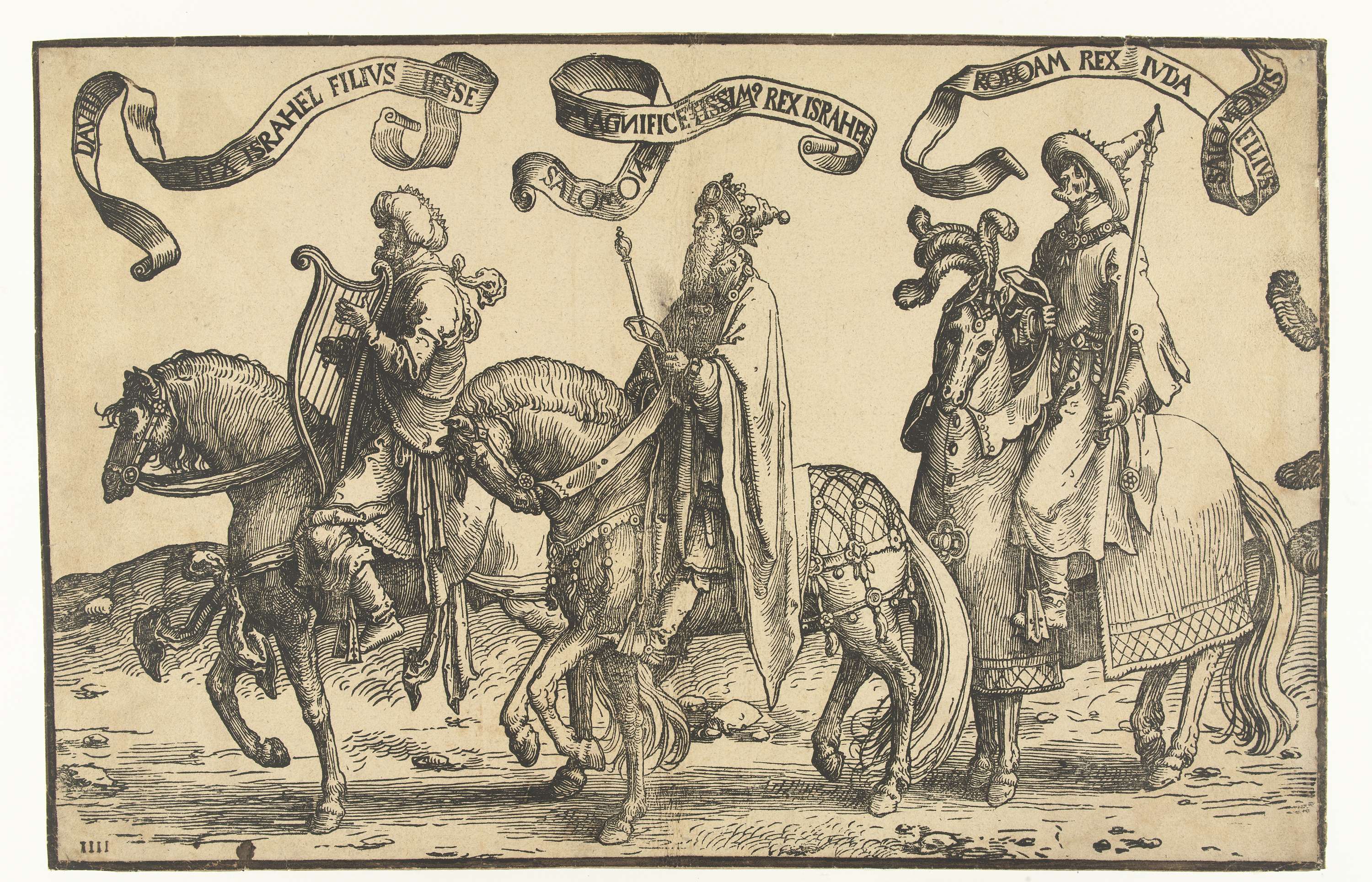 Eén van vier houtsneden, onderdeel van fries met koningen van Israël. David met lier te paard, gevolgd door Salomo en Jerobeam te paard. Boven alle drie banderol met naam en toenaam.