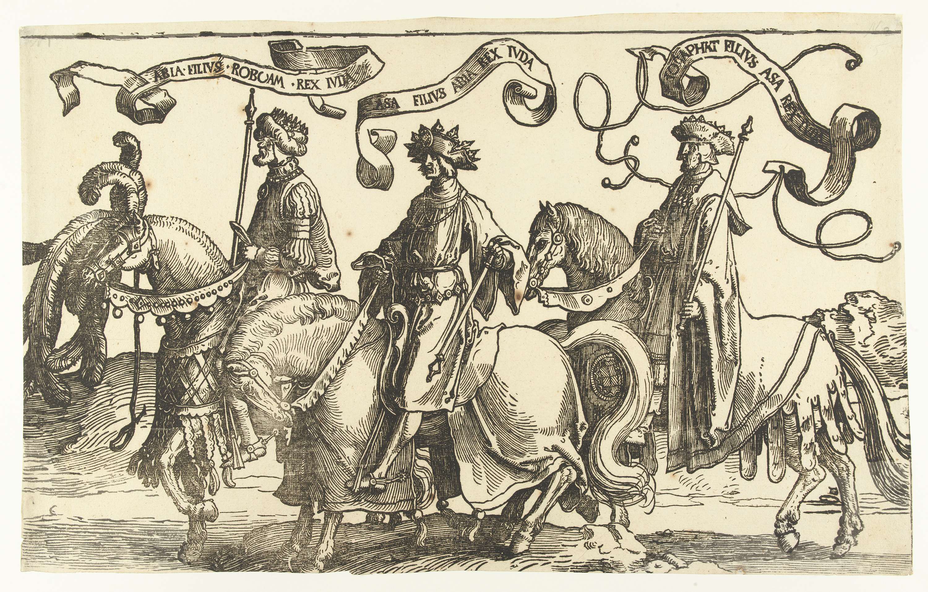 Eén van vier houtsneden, onderdeel van fries met koningen van Israël. Abia, Asa en Josafat te paard. Boven alle drie banderol met naam en toenaam.