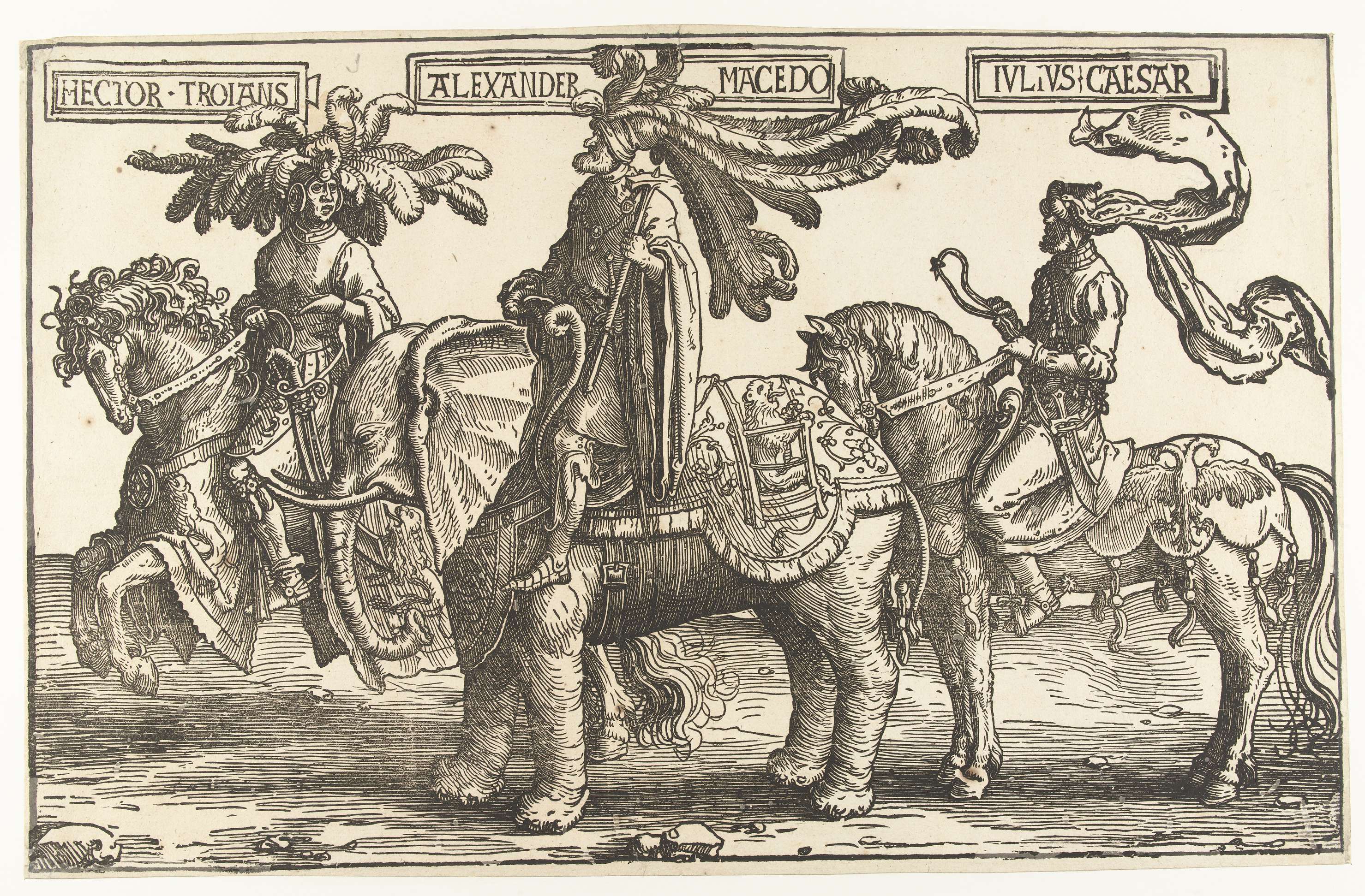 Eén van drie houtsneden, onderdeel van fries met negen helden. Drie helden uit de antieke oudheid: Hector van Troje en Julius Caesar te paard, Alexander de Grote op een olifant. Boven alle drie kader met naam.