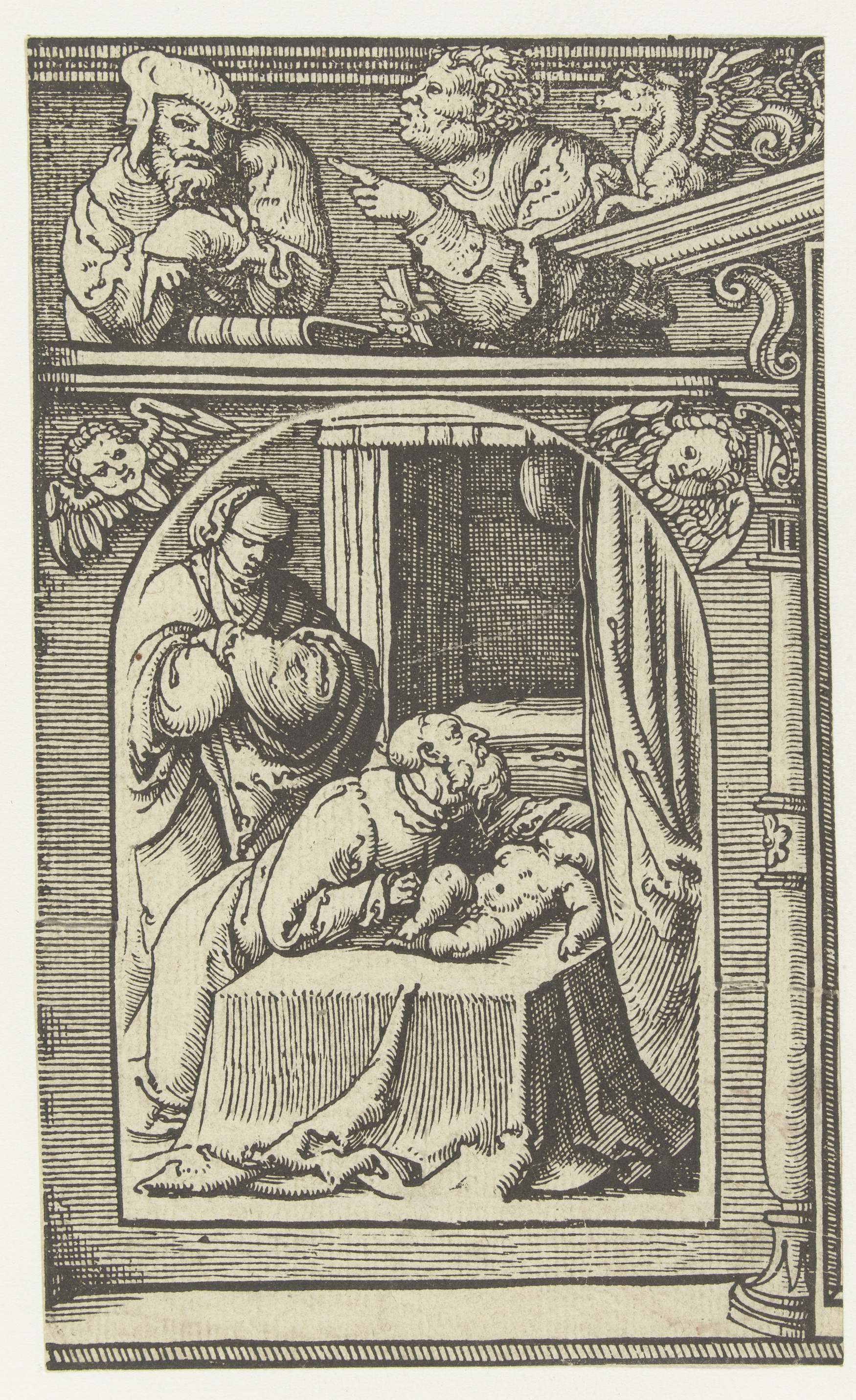 Fragment van een blad uit een Biblia Pauperum. Gedrukt van twee blokken. Weduwe van Zarfath en Elia die haar dode zoon opwekt. Omlijsting met twee profeten.