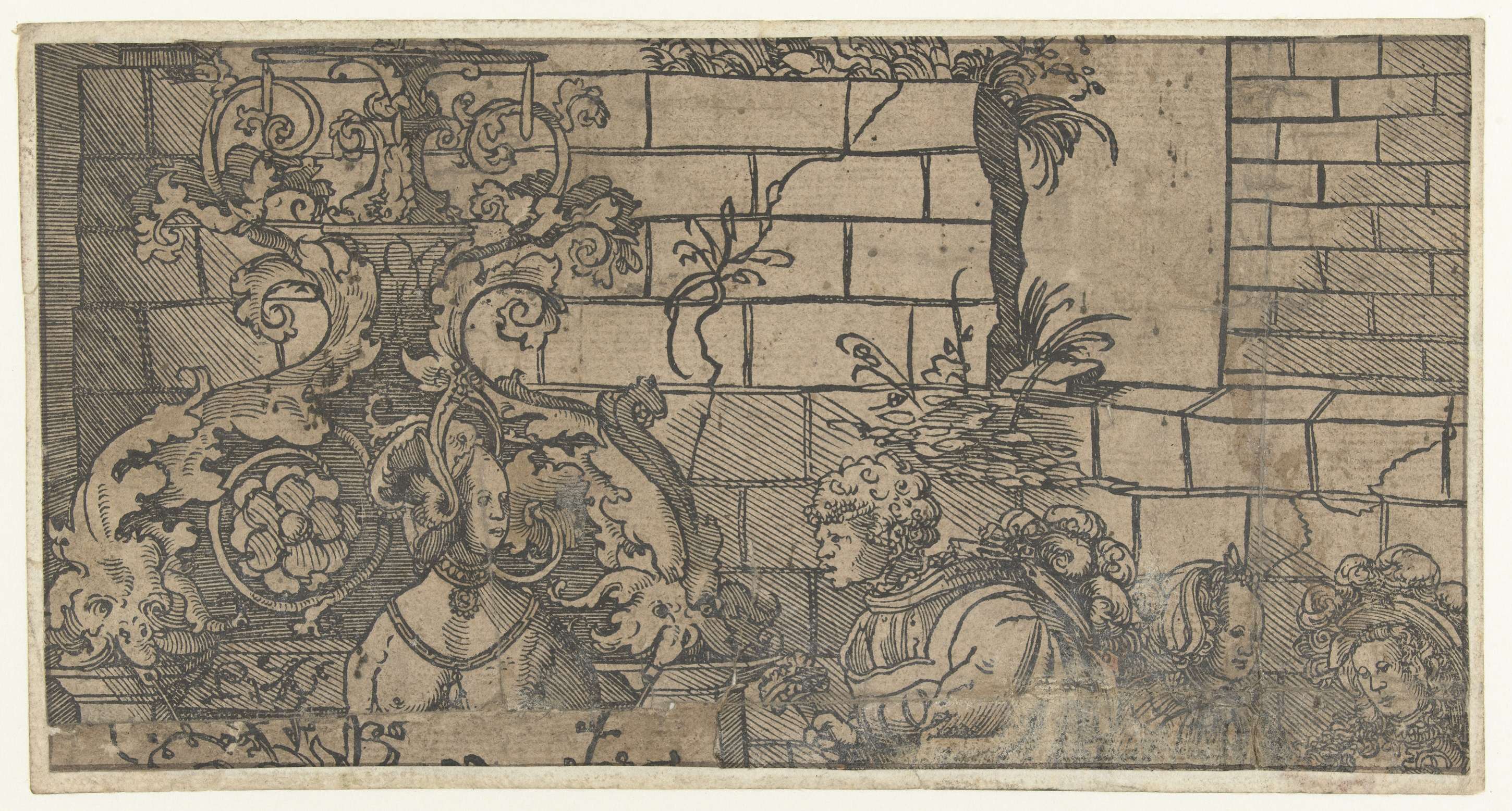 Fragment van een prent van Bathseba en dienaar van David en twee dames, stenen muur als achtergrond. Fragment geplakt op papier, hoek linkersonder komt van andere prent.