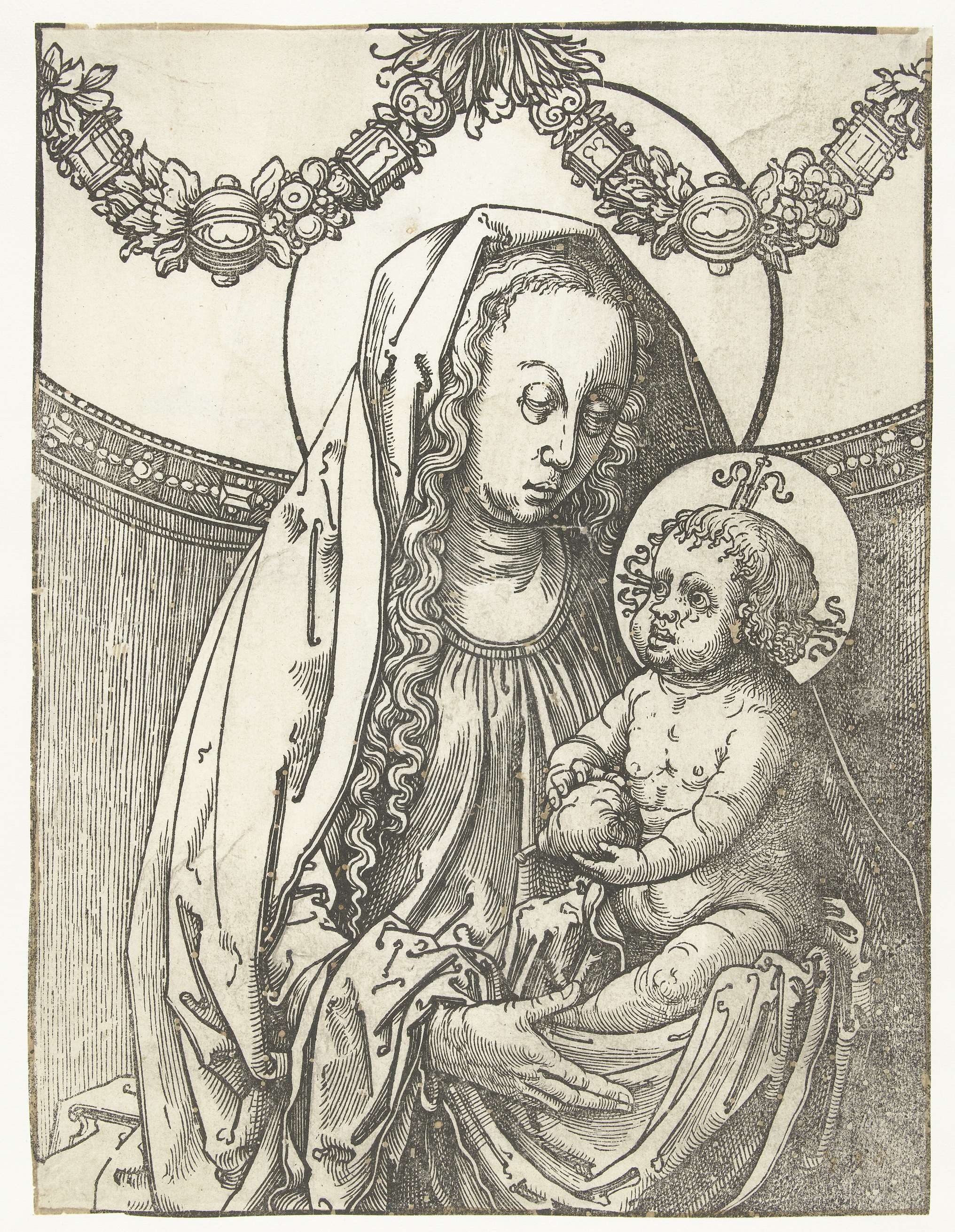 Gedrukt van houtblok met houtworm, opgewerkt met penseel. Maria en Christuskind met peer.