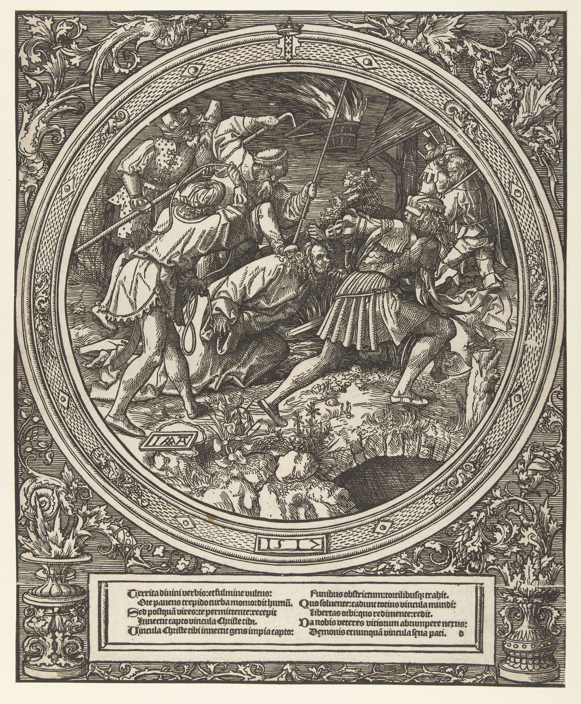 Uit serie van twaalf prenten. Christus, geboeid, wordt door mannen geslagen en geduwd. Rond voorstelling ornamentele omlijsting. Onderaan kader met tekst in het Latijn. Gedrukt van meerdere blokken.