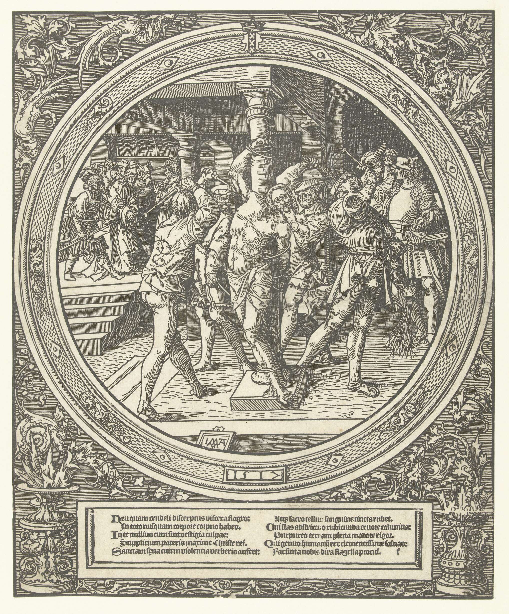 Uit serie van twaalf prenten. Christus, vastgebonden aan zuil, door vier mannen met zwepen geslagen. Rond voorstelling ornamentele omlijsting. Onderaan kader met tekst in het Latijn. Gedrukt van meerdere blokken.