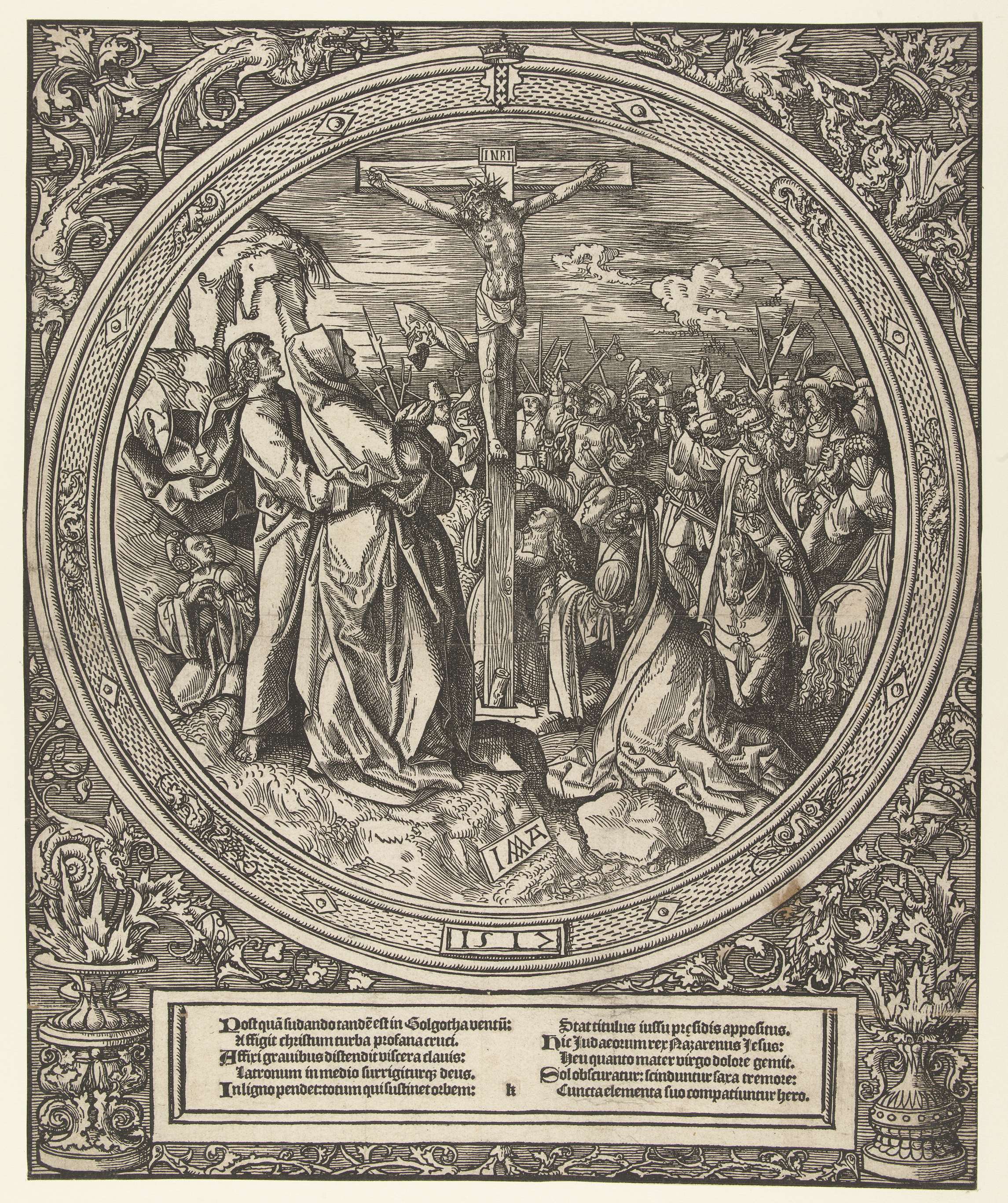 Uit serie van twaalf prenten. Christus aan het kruis. Johannes, Maria en de drie Maria's aan de voet van het kruis. Rond voorstelling ornamentele omlijsting. Onderaan kader met tekst in het Latijn. Gedrukt van meerdere blokken.