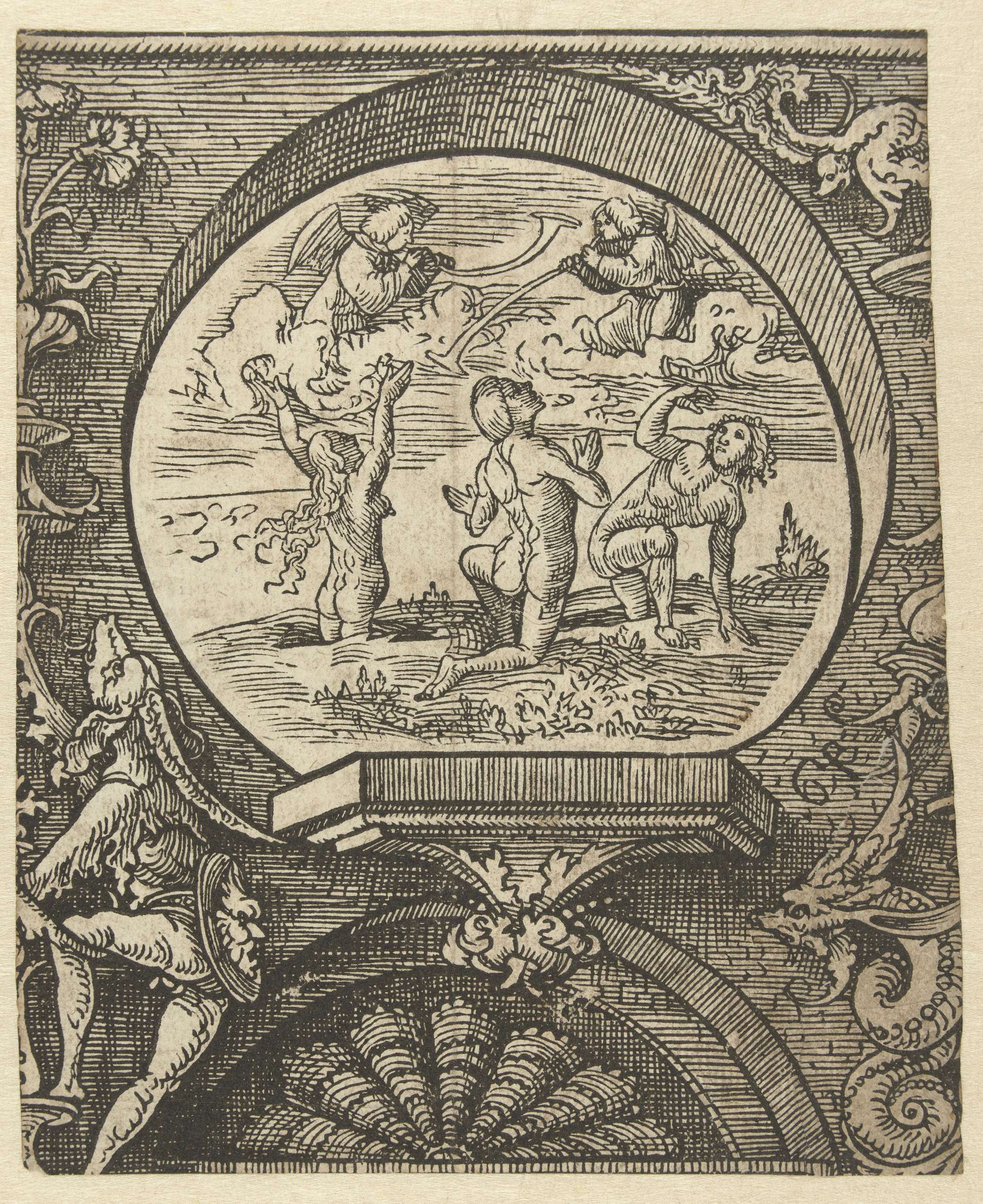 Gedrukt van twee blokken. Ornamentele omlijsting rond voorstelling met twee trompetterende engelen en drie figuren die opstaan.