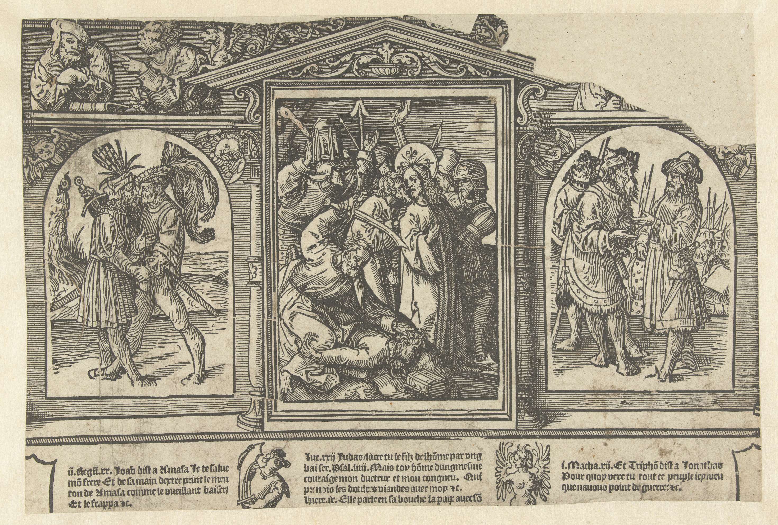 Onderste deel van een blad uit een Biblia Pauperum. Gedrukt van meerdere blokken. Links Joab verraadt Amasa, in het midden Christus gekust door Judas en Petrus met opgeheven zwaard zittend op Malchus, rechts Tryfon verraadt Jonathan. Omlijsting met twee profeten. Tekst in het Frans onder de voorstellingen.